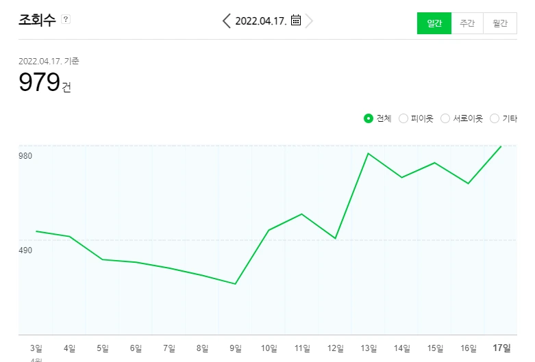 이런 이유로 브런치보다 블로그는 좀 더 나의 승부욕과 성취욕을 자극한다. 아무래도 브런치보다 유입되는 방문자수가 많고 일자별로 내가 어떤 포스팅을 하느냐에 따라 일자별 방문자수를 빠르게 키워나갈 수 있기 때문이다. 그래서 매일매일의 트래픽을 보면서 한 달 뒤에는 일 1천 명의 방문자를 만들겠다는 목표로 운영하려고 한다.