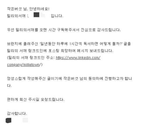 브런치에 글을 쓰면서 가끔 제안 메일을 받곤 했다. 'ㅍㅍㅅㅅ'이라는 웹매거진 사이트에서 내 글을 해당 웹사이트에 실어도 되는지 문의가 오기도 했고 '밀리의 서재' 담당자로부터 내 글을 '밀리의 서재' 링크드인에 공유해도 되는지 문의가 오기도 했다. 물론 따로 돈을 받는 건 없지만 내 글을 좋게 봐주고 더 널리 읽힐 수 있게 되는 기회를 얻은 것이니 뿌듯함이 크다. 이 맛에 브런치에 글을 쓸 때 어떻게 하면 좀 더 고퀄리티의 글을 쓸 수 있을지 다양한 책과 정보를 찾아보곤 한다. 그리고 그 안에서 나 또한 성장하는 재미를 느낀다. 이렇게 꾸준히 쓰다 보면 어느새 진짜 책을 한 권 쓰는 작가가 되어 있지 않을까 하는 기대에 빠지기도 한다.
