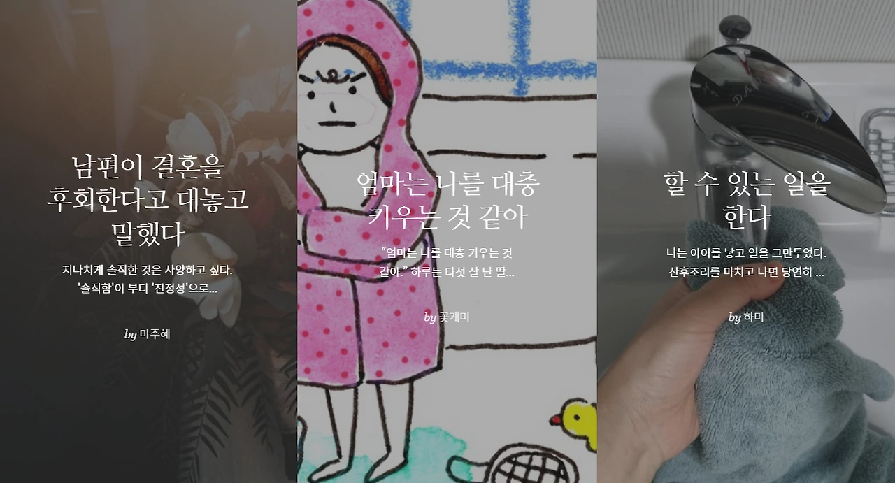 브런치는 제목을 보면 어떤 이야기가 진행될지 궁금해진다. '왜?' 부장님은 회식은 좋아하는 건지? '어떻게' 퇴사 후에 불안을 달랠 수 있는 건지?라는 궁금함이 제목을 보고 떠오르면 클릭하는 방식이다. 물론 브런치에도 정보를 정리하는 글들이 있지만, 그런 정보들이 인터넷 서칭을 통해 쉽게 얻을 정보라기보단 저자의 인사이트와 경험을 토대로 정리된 정보들이 많다.