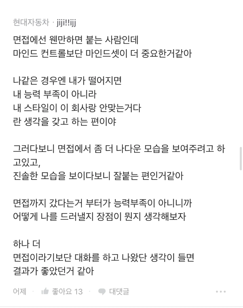 이직 준비를 하다 보면 괜히 마음이 붕붕 떠서 기존 회사 업무를 소홀히 하기 쉽다. 이전에 나는 연차를 쓰거나 기존 업무를 해야 할 시간에도 이직 면접을 준비한 적이 있었다. 그렇게 연차를 쓰면서까지 시간을 투자해 준비하면 꼭 붙고 싶다는 간절함도 생긴다. 꼭 붙고 싶다는 간절함에 연차를 쓰면서까지 준비한 걸 수도 있지만. 어쨌든 이렇게 간절하게 나의 기존 업무를 소홀히 하면서까지 준비하다 보면 면접장에서 긴장을 하게 된다. 간절한 만큼 긴장된다. 그래서 나의 능력을 여유롭게 보여주지 못한다.