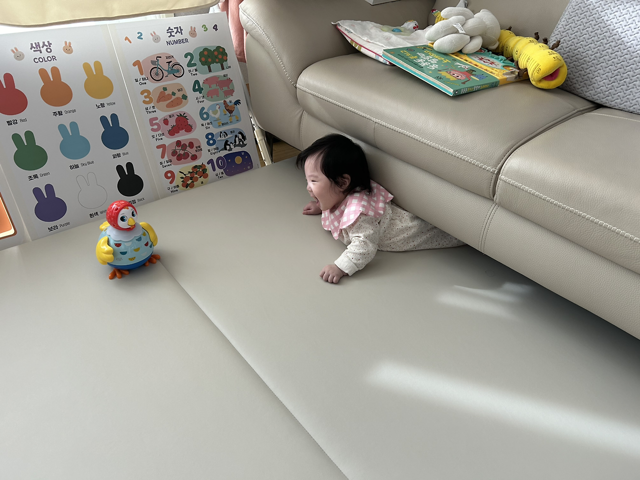 이제 네가 제법 배밀이를 하는지, 매트 위에 올려두면 360도 회전을 하기 시작했어. 앞으로 전진은 못해도, 뒤로 후진하며 소파 밑이고, 거실장 밑이고 여기저기 집안을 탐색 중인 모습을 보면 대견하기도 하고 웃기기도 해.