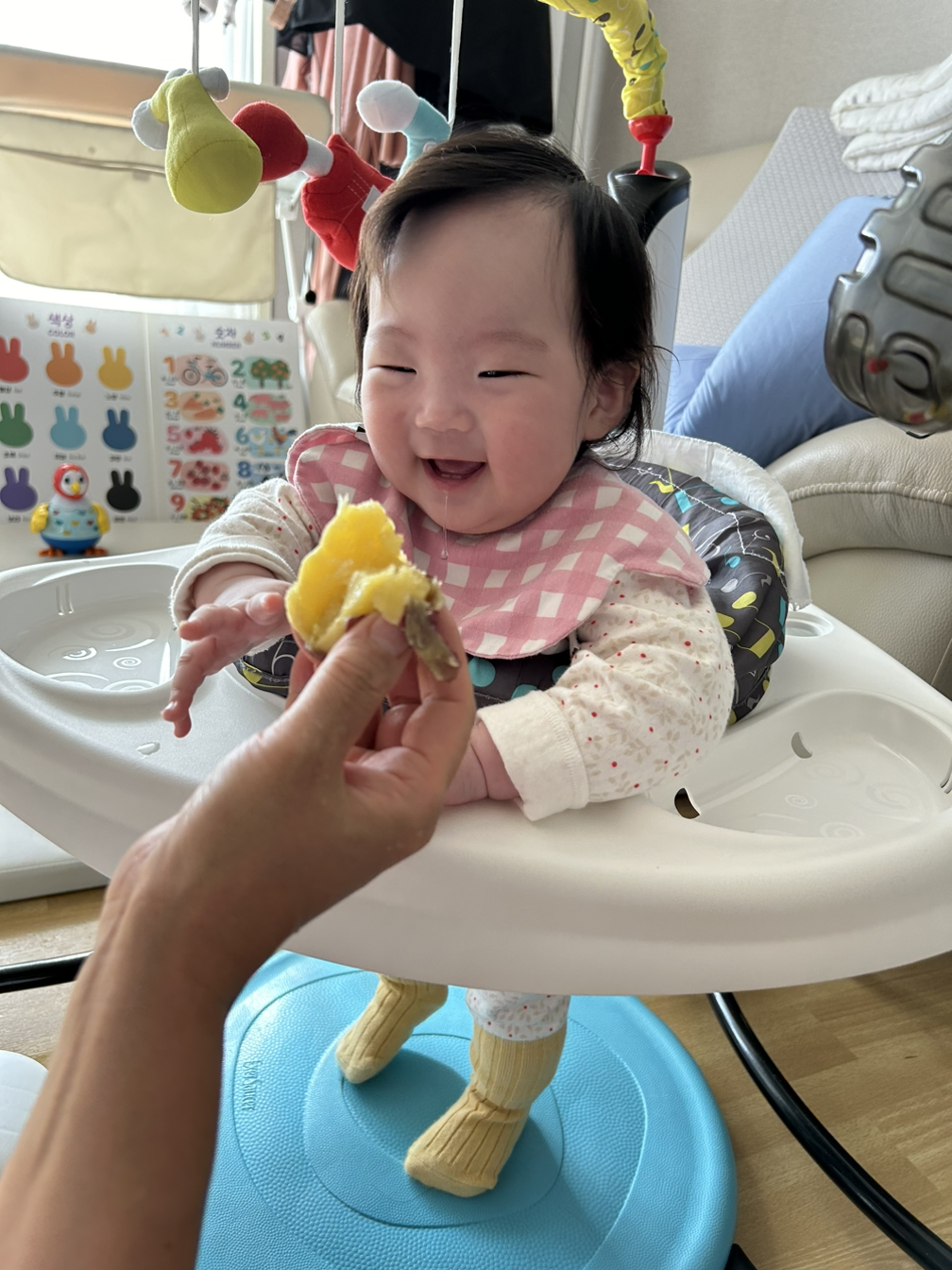 고구마가 뭔지도 모르면서 고구마를 보면서 까르르 웃는 너를 보면, 평범했던 하루가 기억에 남을 찬란한 순간으로 뒤바껴. 아니 사실 너의 소리, 몸짓, 눈짓 하나하나에 엄마는 웃을 일 투성이고, 행복한 일 투성이야. 엄마의 세상에 짠~하고 나타나서, 하루하루 기쁨과 행복을 가득 채워주는 우리 딸! 고구마는 조금 더 있다 줄게 침 닦자 ㅎㅎㅎ