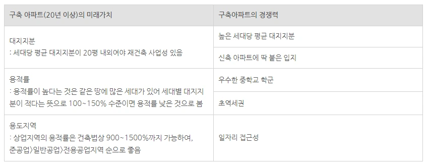 투자 관점에서 본다면, 투자금액 대비 높은 수익률을 얻는 것이 중요합니다. 그렇기에 20년 이상의 구축 아파트를 매수한다면, 재건축/리모델링 가능성이 있는 곳으로 매수하는 것이 중요합니다. 설사, 재건축/리모델링이 당장 진행되지 않더라도 사업성이 있는 아파트라는 것만으로도 하방경직성이 단단하기 때문입니다.