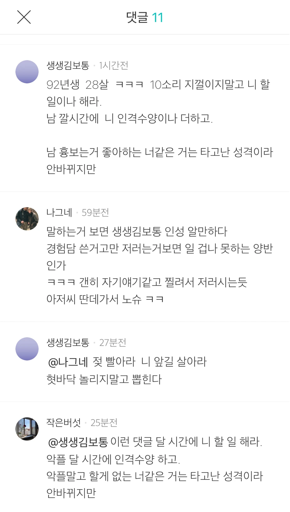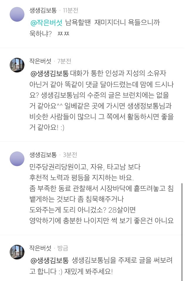 그래서 오늘 악플에 댓글을 남겼다. 보통 때는 다른 분이 대응을 해주시면 그걸 보고 있는데 다른 독자분이 대응한 댓글에도 걸죽한 욕으로 아주 부끄러운 댓글을 남기는 걸 보았다. 부끄러움 조차 모르는 사람인 것이다. 그래서 악플러와 똑같은 내용을 반사로 썼다. 본인이 쓴 글을 본인이 직접 느껴보라는 의도였다. 그럼에도 악플러는 본인이 단 댓글에 부끄러움을 알지 못했다. 그래서 댓글을 단 수준을 보니 정상적인 범주의 논리와 인성이 없는 사람으로 보였고 비슷한 수준을 가진 다른 사이트에서 활동하실 것을 추천드렸다.