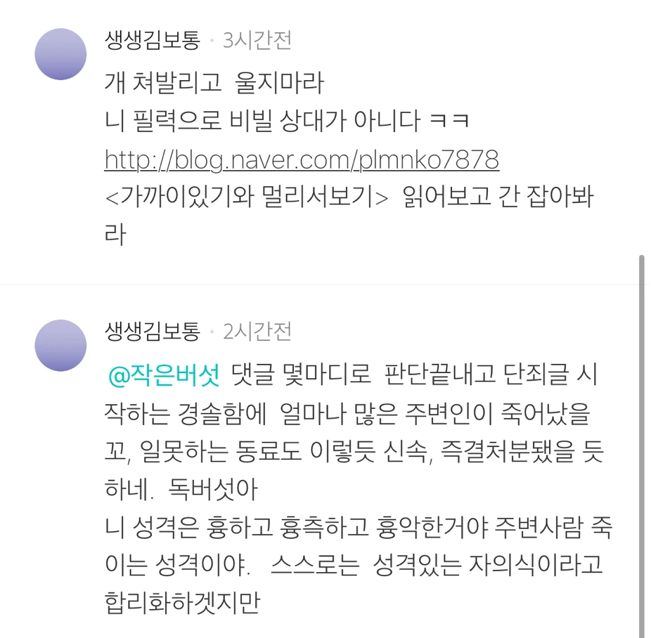 비아냥거림 혹은 비난, 또한 공개적인 글쓰기 하면 어쩔 수 없이 겪어야 하는 것이라고 생각하여 평소 아무런 대꾸를 하지 않았었다. 내가 굳이 대꾸하지 않아도 문제가 있는 댓글에는 다른 독자분들이 댓글로 대응해주셔서 내가 나서지 않아도 악플을 다신 분이 댓글을 지우고 도망가곤 했다. 그런데 오늘 달린 댓글은 도를 넘어섰다. '10소리'라는 비속어를 섞은 댓글을 보었다. 논리적인 비판이 아닌 원색적인 인신공격의 댓글이었다.