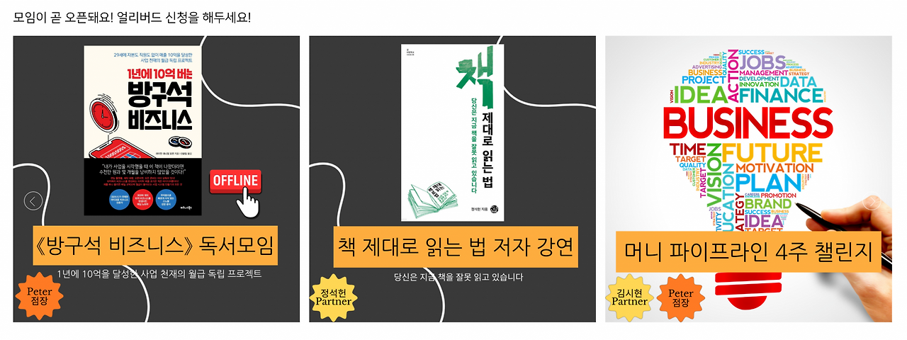 관심 있는 상품을 미리 신청해주세요. 얼리버드 할인을 상품이 오픈되면 놓치지 않게 카톡 알림톡을 보내드릴게요. 이곳에서 신청을 하셨다고 해서 반드시 상품이 오픈되었을때 구매할 필요는 없어요. 상품이 오픈되면 잘 살펴보시고 결정하시면 됩니다. 그럼 오픈 예정 모임도 많이 사랑해주세요! 늘 감사합니다.