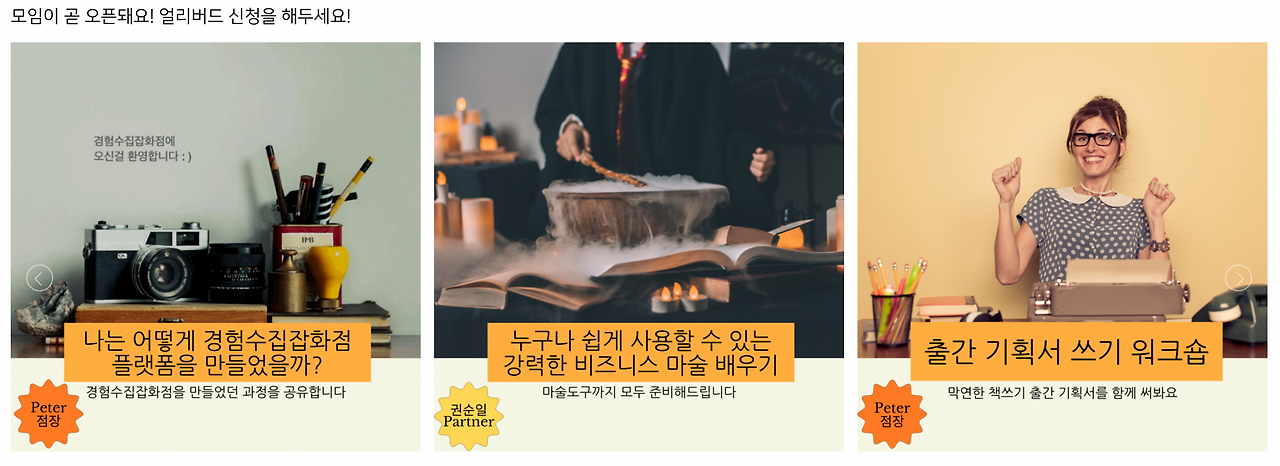 경수점에 오픈 예정 모임을 알리는 공간이 생겼어요. [경험쇼핑] 메뉴 페이지에 가장 아래쪽에 보시면 사진처럼 오픈 예정 모임들을 보실수 있어요.