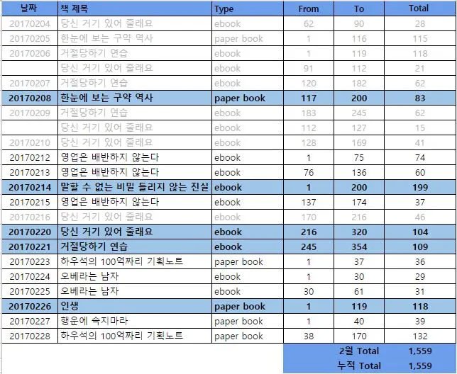 2월은 정리할 짬이 생겨 간단히 정리. 매일 매일의 독서노트를 Google 스프레드 시트에 정리하고 있다. 이렇게 정리해 두면 특별히 월말에 따로 정리하려고 하지 않아도 쉽게 그 달의 독서 현황을 알 수 있어 좋다.