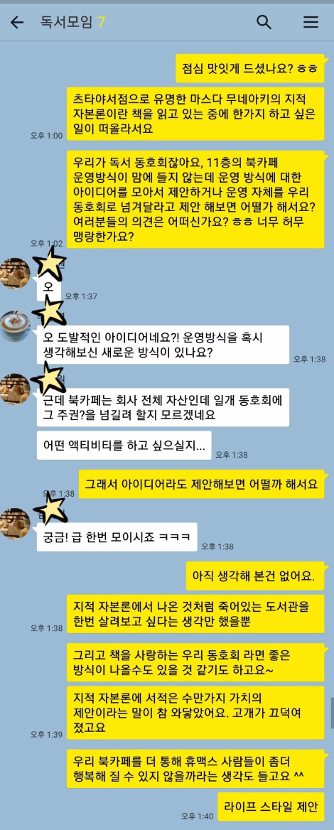 그래서 앞서 이야기 했던 새롭게 해보고 싶은 일에 대해 독서모임 멤버들에게 공유했다. 그것은 회사의 북카페 공간을 바꿔 새로운 가치를 제안해 보자는 것이었다.