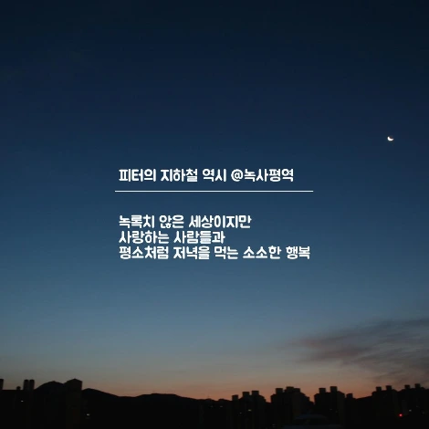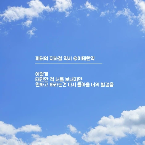 3호선을 시작으로 분당선, 2호선, 8호선을 거쳐 이번에 6호선 역까지 마무리를 했습니다. 올해는 여기까지 일 것 같네요. 가볍게 읽어봐 주시고, 맘에드는 역은 댓글로 알려주시면 감사하겠습니다. 직접 역이름으로 시를 지어 남겨주시면 더 재밌을 것 같고, 지하철 역이 아니라도 N행시 짓기 원하시는 단어가 있으면 댓글로 남겨주세요. 틈틈히 시도해 보겠습니다.