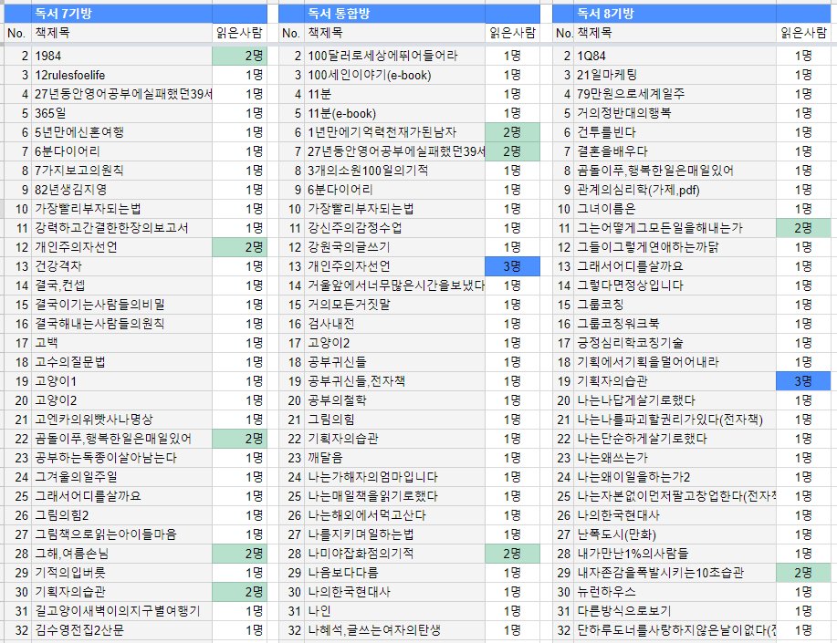 하루에 15분 독서를 매일 이어나가는 온라인 모임을 3개 진행하고 있다. 몇 달 전부터 각 방에서 매일 인증하는 데이터를 수집하고 있는데, 문득 사람들은 요새 어떤 책을 많이 읽고 있을까란 호기심이 일었다.