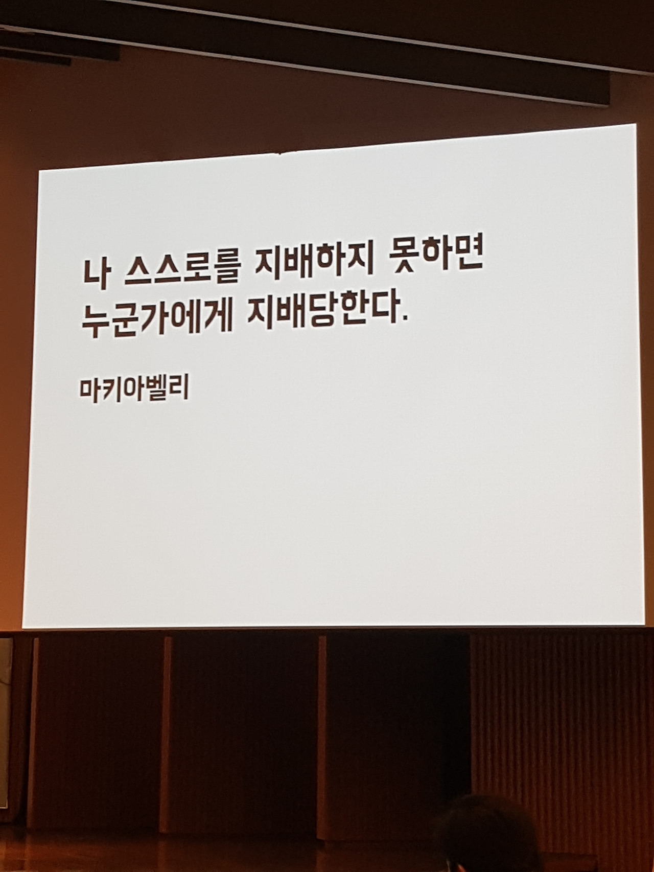 좋은 연사분들의 말씀들이 있었지만, 그중 배달의 민족으로 더 알려진 우아한형제들 김봉진 대표님의 마지막 말이 귓가에 맴돌았다. 특강 말미에 전달한 마키아벨리의 말이었는데, '나 스스로를 지배하지 못하면 누군가에게 지배당한다'는 말이었다. 개인적으로 좋아하는 말이라고 하셨다.