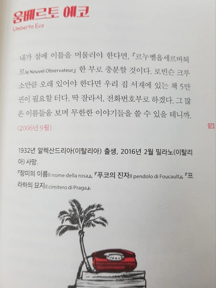 독특한 답변들도 있었다. 움베르토 에코는 전화번호부를 챙겨가겠다고 답변했다. 그 많은 이름들을 보며 무한한 이야기들을 쓸 수 있을 거라는 이유와 함께. 더 재밌는 것은, 이 질문이 너무 재밌어 내가 운영하고 있는 [하루15분 독서] 채팅방에 동일한 질문을 올렸는데, 움베르토 에코와 똑 같이 전화번호부라고 답변한 사람이 있었다는 점. ㅎㅎ