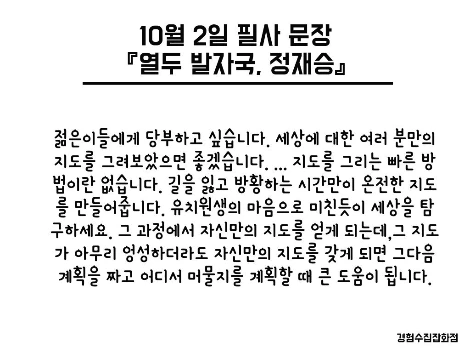 특별히 젊은이들에게 '나만의 인생지도 그리기'를 이야기한 부분이 좋았다.