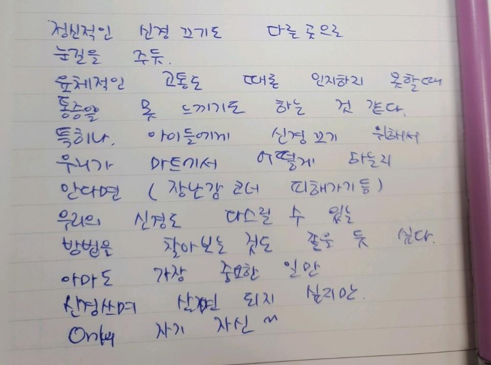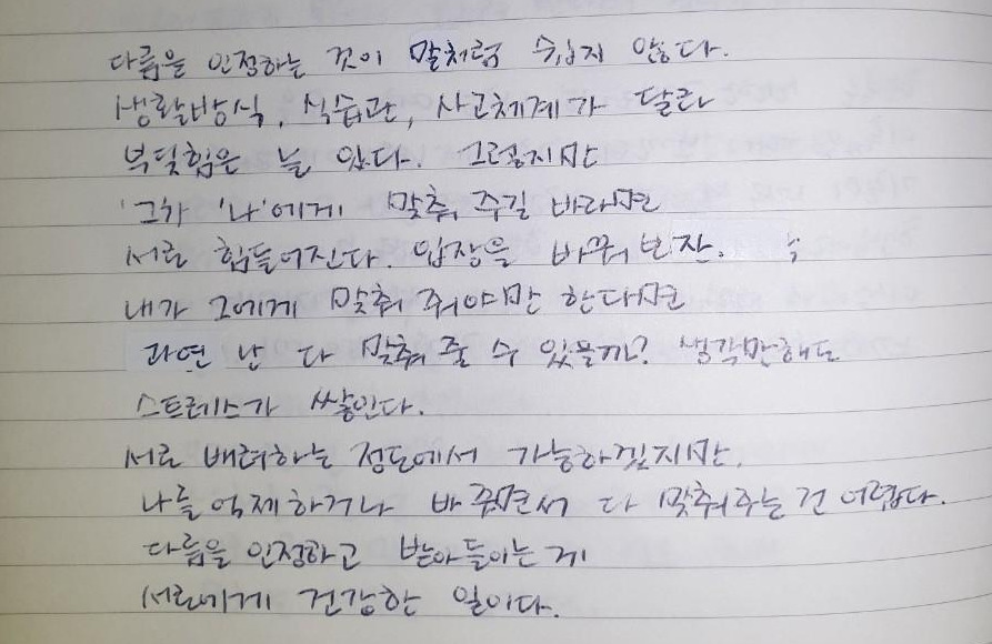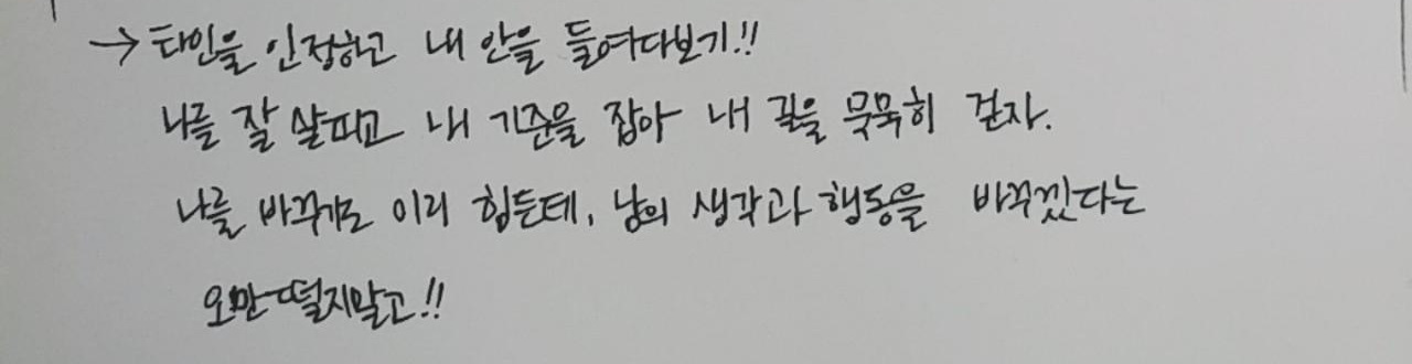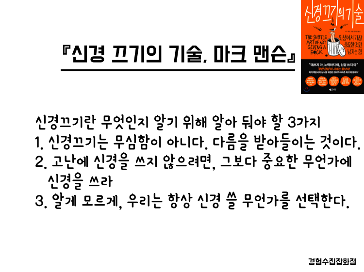 이 책의 저자인 마크 맨슨은 신경 끄기를 무심함이 아닌 다름을 받아들이는 것이라고 정의했다. 인간관계에서 오는 문제들 중 하나가 다름을 인정하지 않는 태도에서 발생한다고 생각한다. '내가 생각하기엔 이게 옳은데 저 사람은 도대체 왜 저렇게 행동하는 거지?'라는 생각이 들기 시작하면 온통 신경이 그쪽으로 쏠린다. 쿨하게 다름을 인정하면 오히려 더 이상 신경 쓰이지 않을 때가 있다는 걸 경험해 본 사람을 알 거다. 그리고 어차피 신경 쓰는 것을 아예 멈출 수 없다면, 고난 등의 부정적인 상황에 머물러있기보다는 그 보다 중요한 무언가에 신경을 돌리라는 저자의 조언도 실용적이라는 생각이 든다. 이제 노트를 꺼내 필사를 시작해 보자!! 그리고 생각해 보자 나는 어떤 껏에 신경을 끌 것인가?