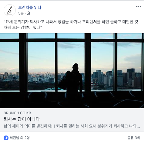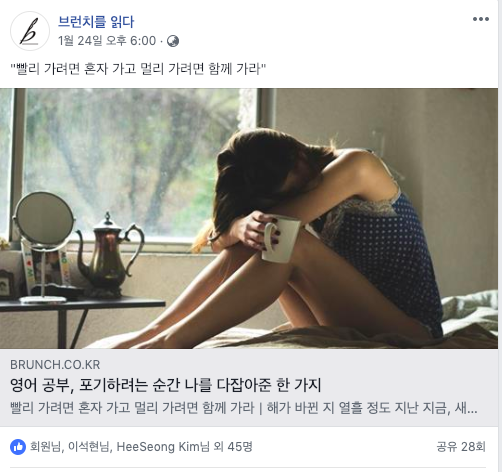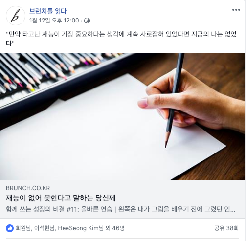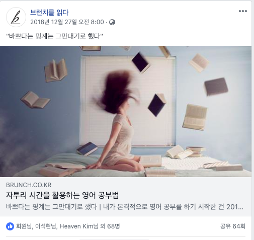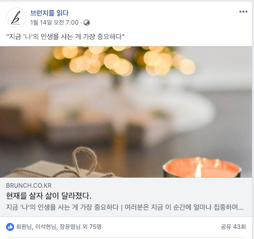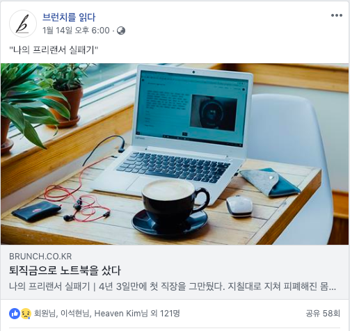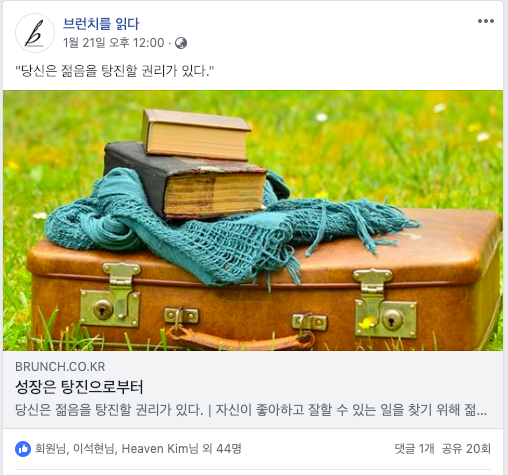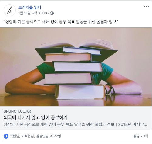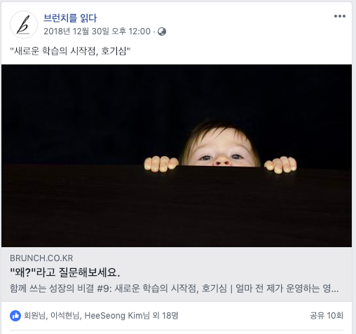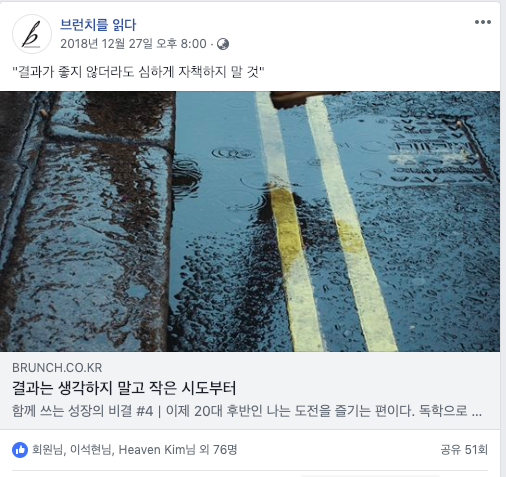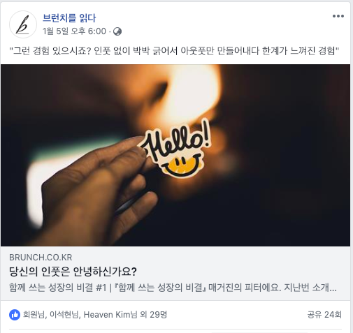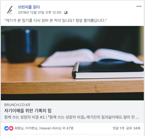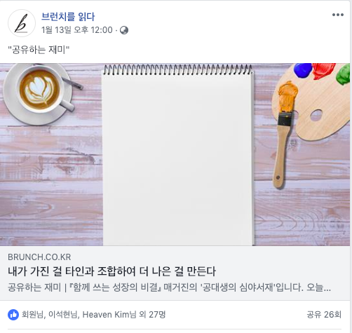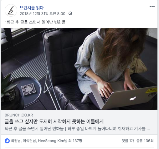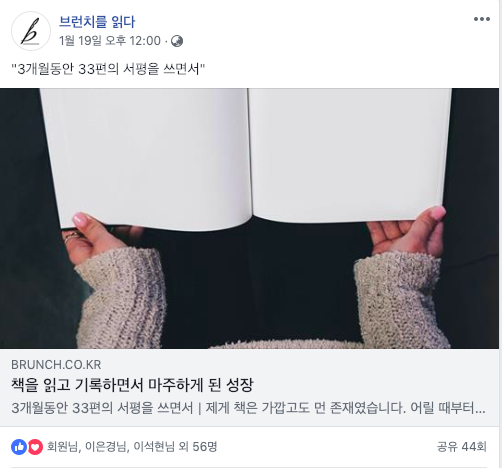그동안 많은 분들이 사랑해 주셔서, 구독자도 300명에 도달했고, 공유 수도 4천 회를 넘겼습니다. 매거진 작가님들을 대표해서 한 번 더 감사의 말씀 전합니다. 브런치의 페이스북 페이지인 '브런치를 읽다'에도 20번이나 노출되는 행운을 누릴 수 있었습니다.(약 절반의 글이 소개되었네요) 브런치 스릉 해요~~ 이 외에도 네이버 테크판 메인과 다음에도 지속 노출되었고, 희성 작가님의 글쓰기 글은 브런치 플러스 친구를 통해서도 발송이 됐습니다.