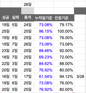 오늘까지 멤버들의 도전 결과를 공유합니다. 하루 이틀 아직 인증을 놓치신 분들이 있지만 인증기준 모두 70% 이상을 넘게 유지하고 계십니다. (한 분은 3/28일부터 합류) 아마 모두 성공하시리라 생각됩니다.