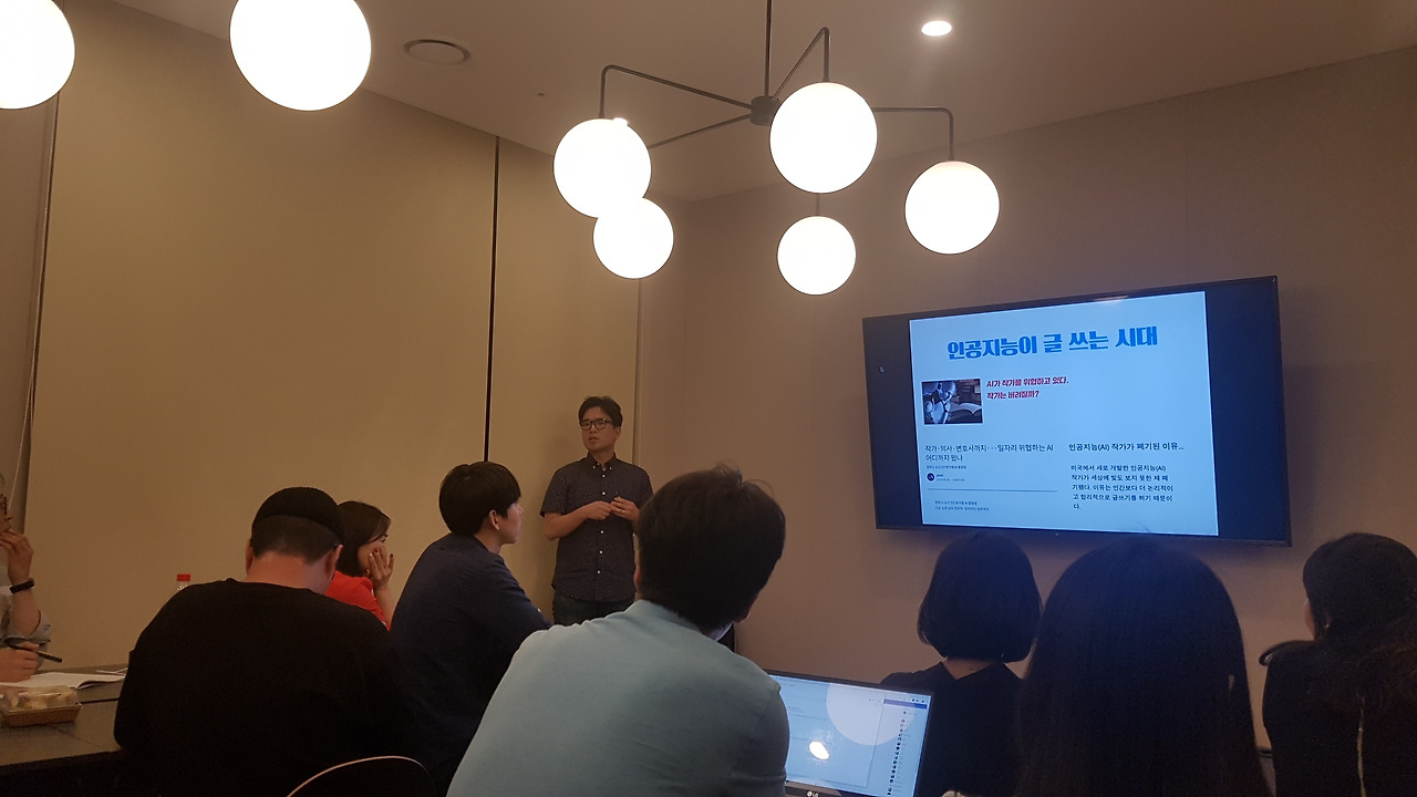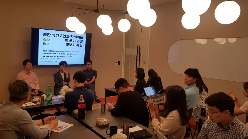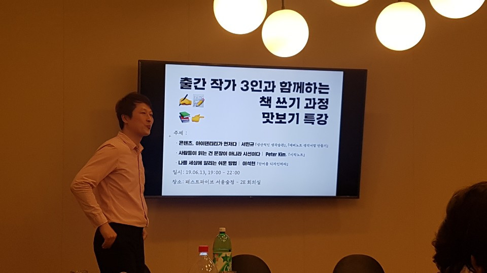 그리고 드디어 어제 특강을 했습니다. '책 냈다고 있는 척하지 말고 리얼한 출판 이야기를 해보자. 어떻게 하면 사람들에게 책 쓰기에 도움을 줄 수 있지 않을까? 적어도 맛이라도 보여주자.'는 생각으로 저희 셋이서 각각 미니 특강을 진행하고 Q&A 하는 시간도 충분히 가졌습니다. 사람들이 어떤 걸 궁금해하는지, 어떤 걸 하고 싶어 하는지 들을 수 있는 시간이었고, 저희 셋도 이런 행사를 진행하며 케미를 맞춰본 게 처음이라 의미도 있는 시간이었네요. 끝나고 간단히 시원한 맥주를 한 잔 하며 오늘 있었던 행사를 리뷰하고, 어땠는지 느낌들을 이야기 나눴습니다. 그리고 1회성으로 끝내지 않고 더 많은 특강을 이어 가기로 했습니다. 특강만 해서는 실제로 변화를 이끌어내기는 힘들다는데 동감하고, 커뮤니티를 만들어 실제로 도움이 될 수 있는 <책 쓰기 과정>도 준비해 보기로 했습니다. 서두르지 않고 조금씩 말씀드릴게요~