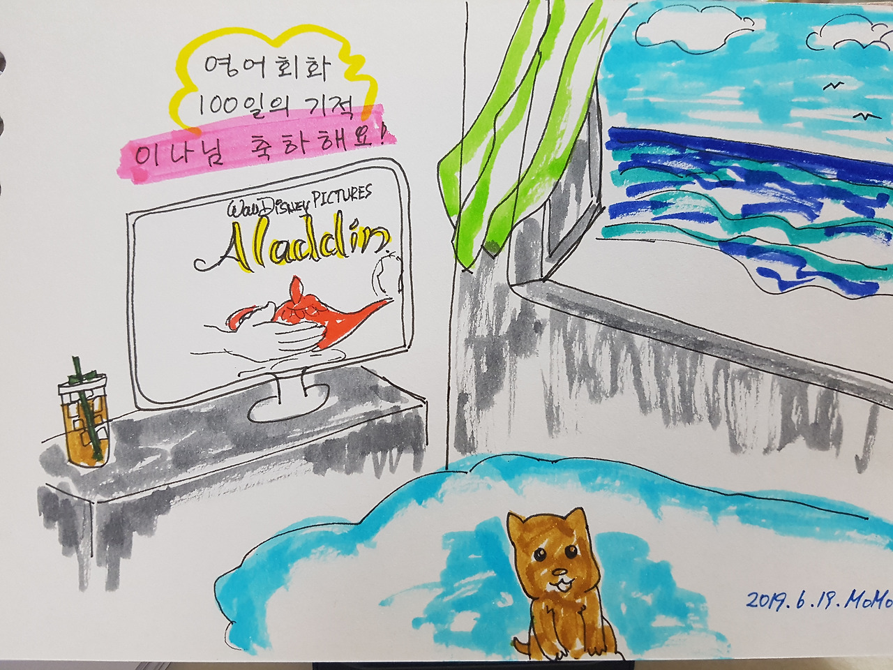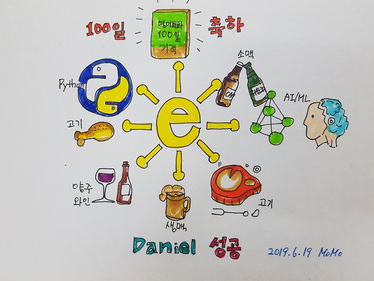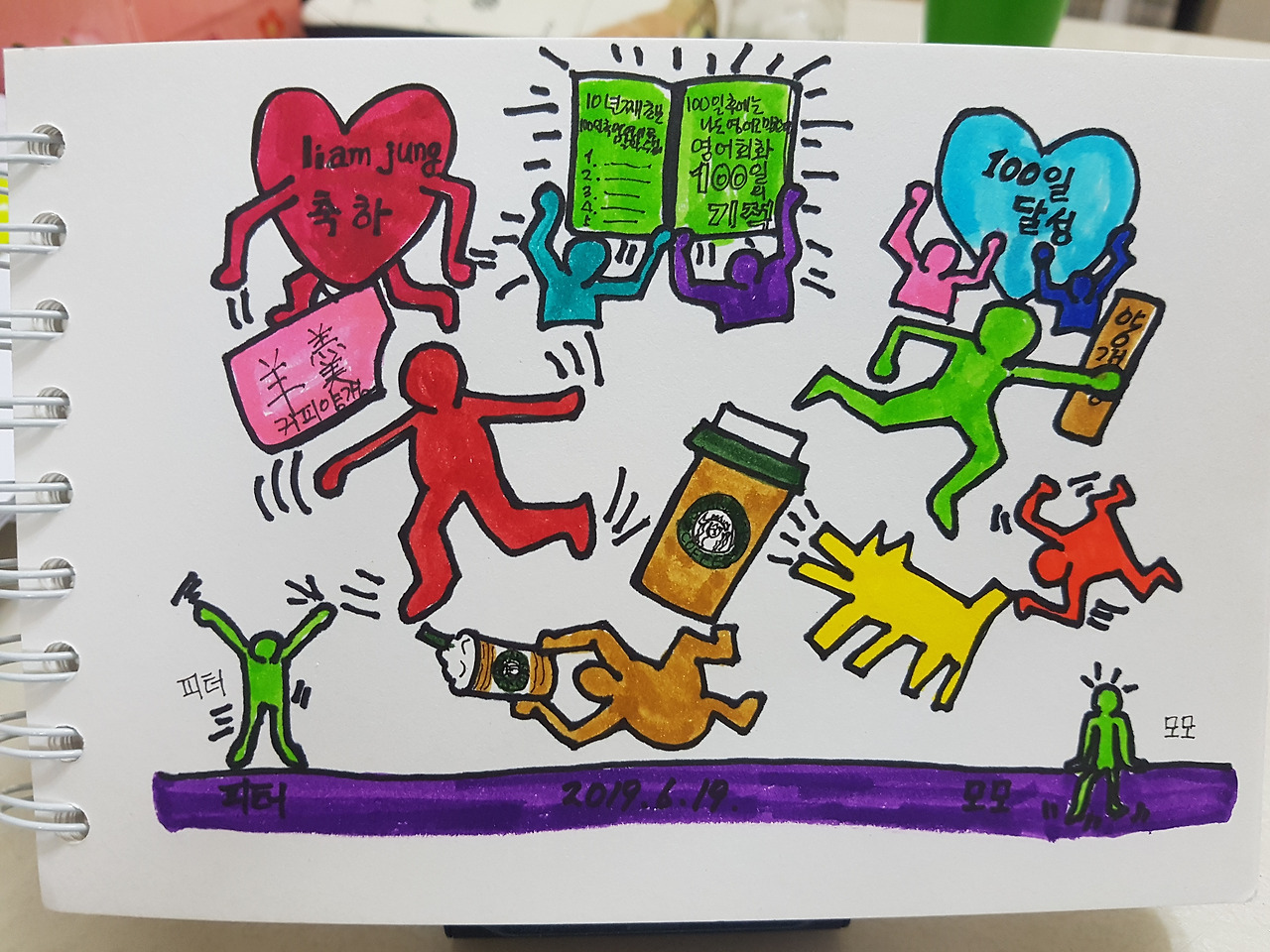 놀라운 일이 하나 더 있는데요? 모모님이 100일 달성하신 분들께 좋아하는 단어를 물어보시고는 뚝딱 그림을 그려 100일 달성 축하 선물도 주셨어요. 뚝딱 그림 그려내시는 솜씨 부럽습니다..ㅠㅡㅠ
