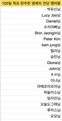 사실 목표를 달성한 4명 중 3명은 이번이 100일 달성이 처음은 아니었어요! (더 놀랍!) liam jung님은 무려 7번 이상을 완주한 이력을 가진 무서운 분이시고, Daniel님과 이나님도 이전에 완주 이력이 있으신 분들이죠. 모모님은 새롭게 명예의 전당에 등극하셨습니다. 다시 한번 축하드립니다. (^^)