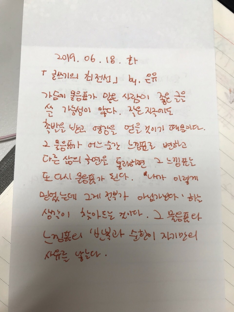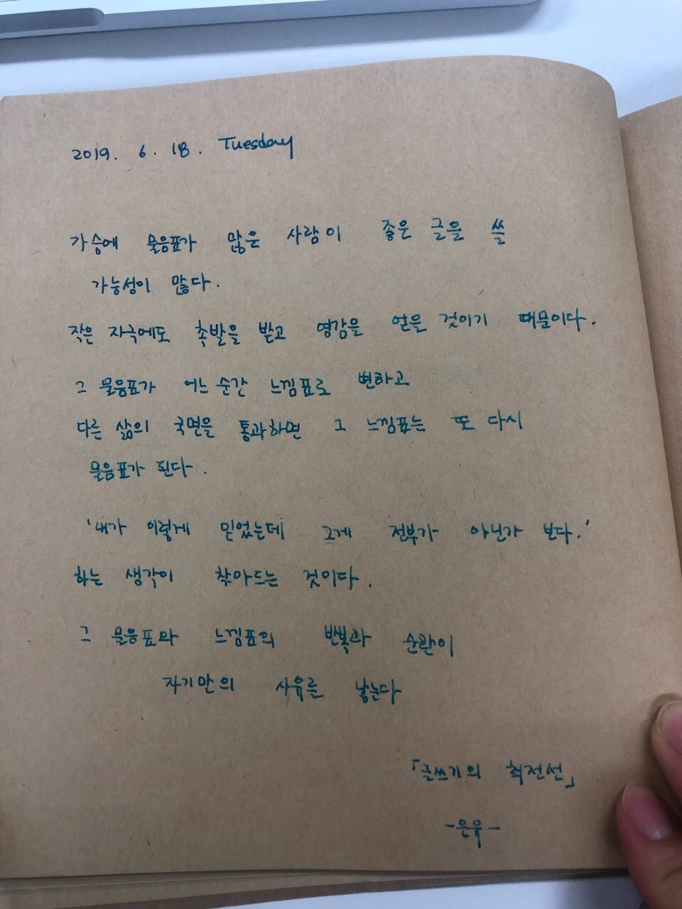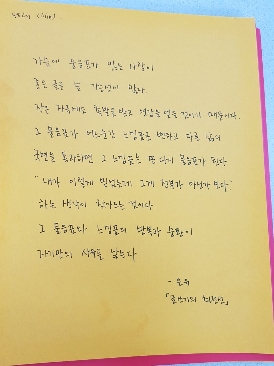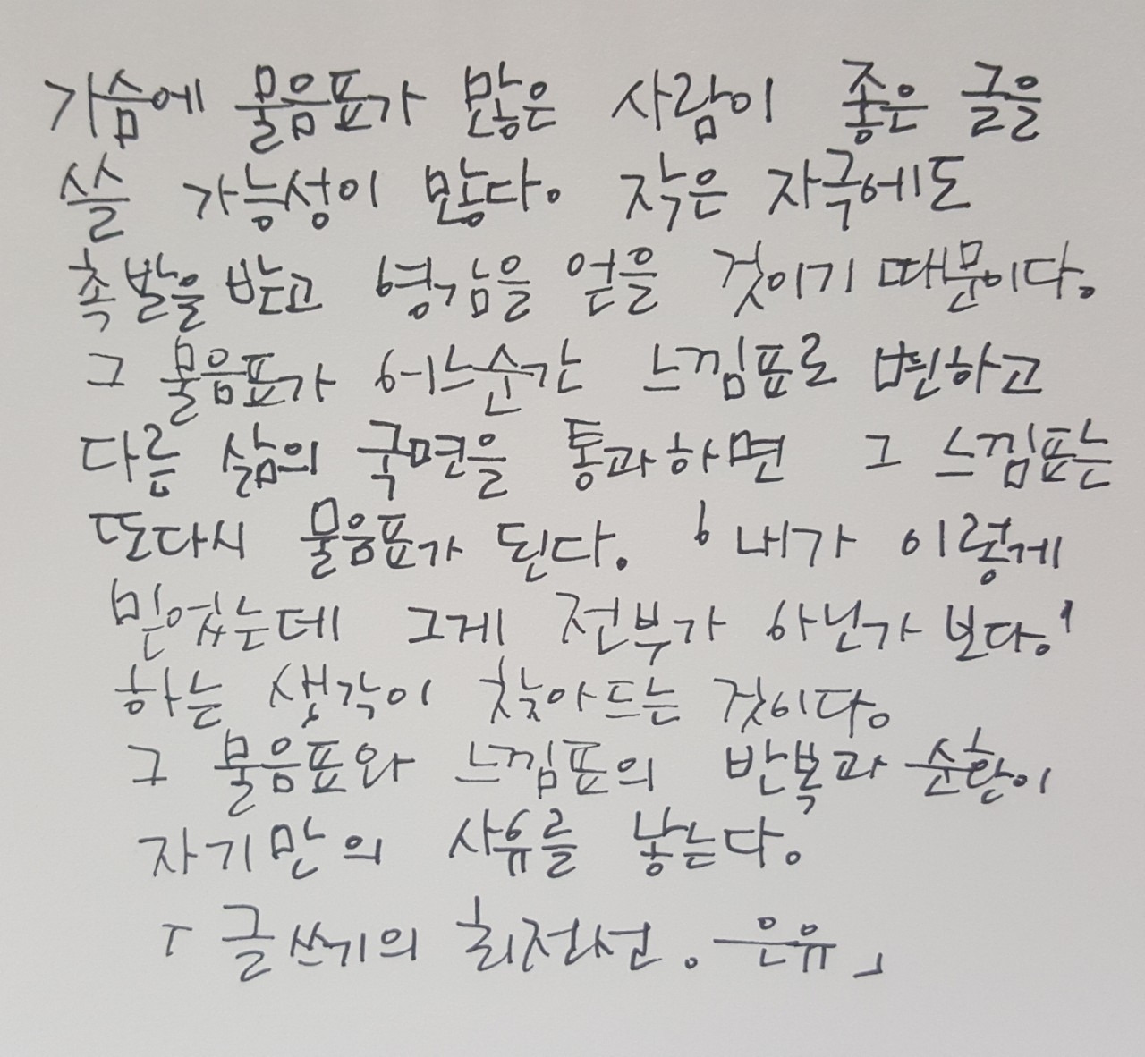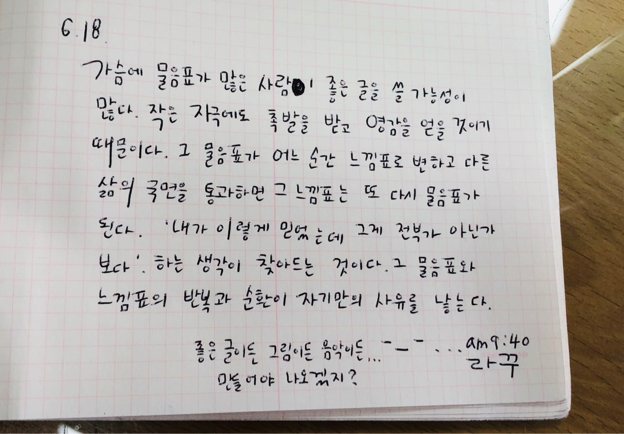 그 질문이 여러분의 삶을 통해 답을 찾아가지 않을까 생각합니다. 그 과정에서 물음표는 느낌표로 변하고 또다시 삶의 국면을 지나며 물음표가 되어 가겠죠 (^^) 문장을 그냥 읽는 것과 실제로 펜을 들고 종이에 적어보는 건 느낌이 완전 다르더라고요. 오랜만에 펜을 들어 필사 한번 해보시면 어떨까요?