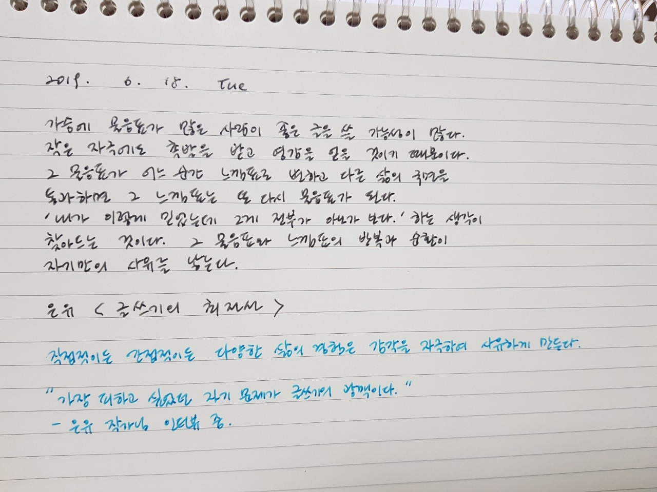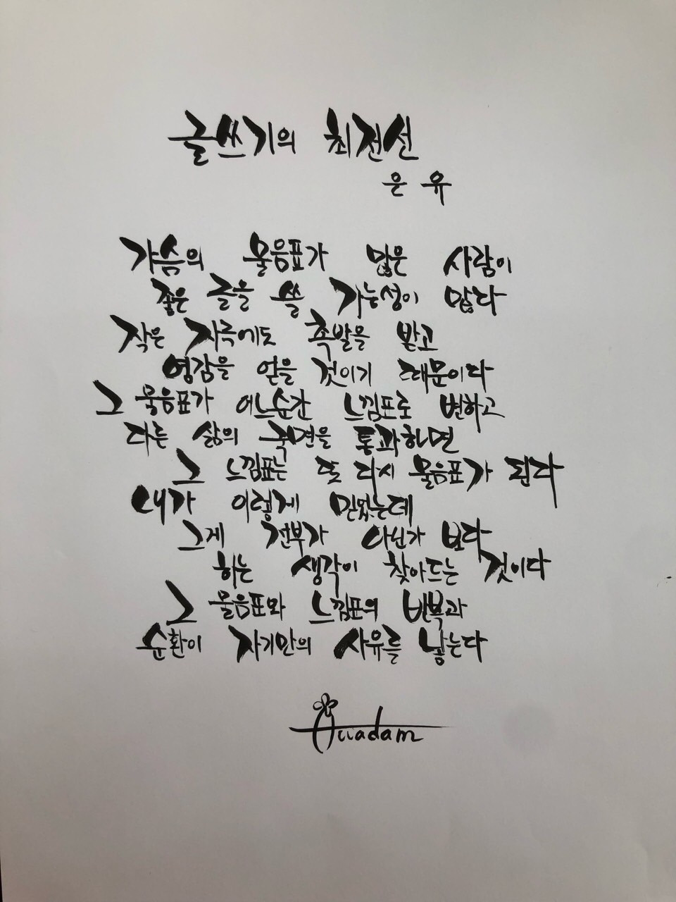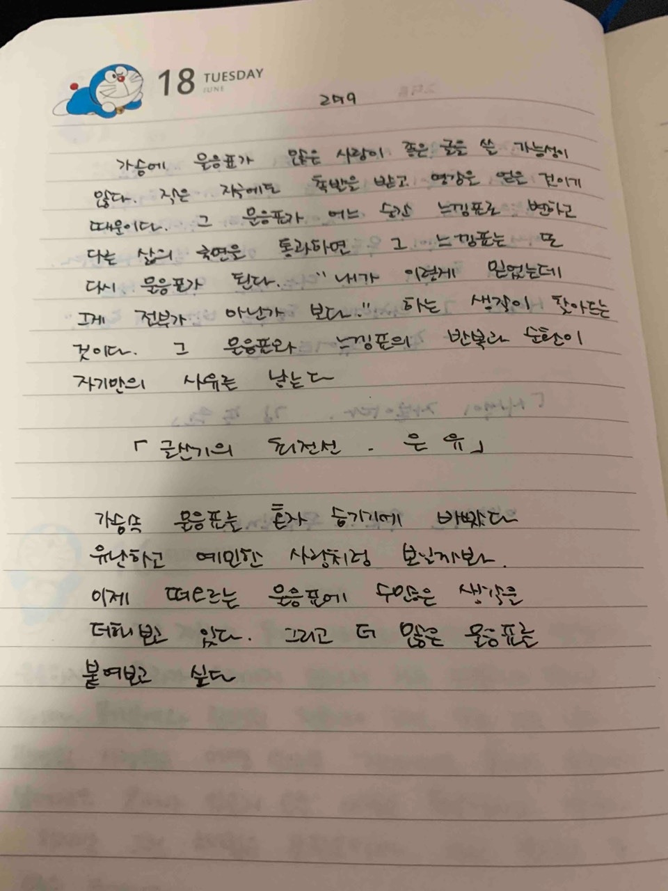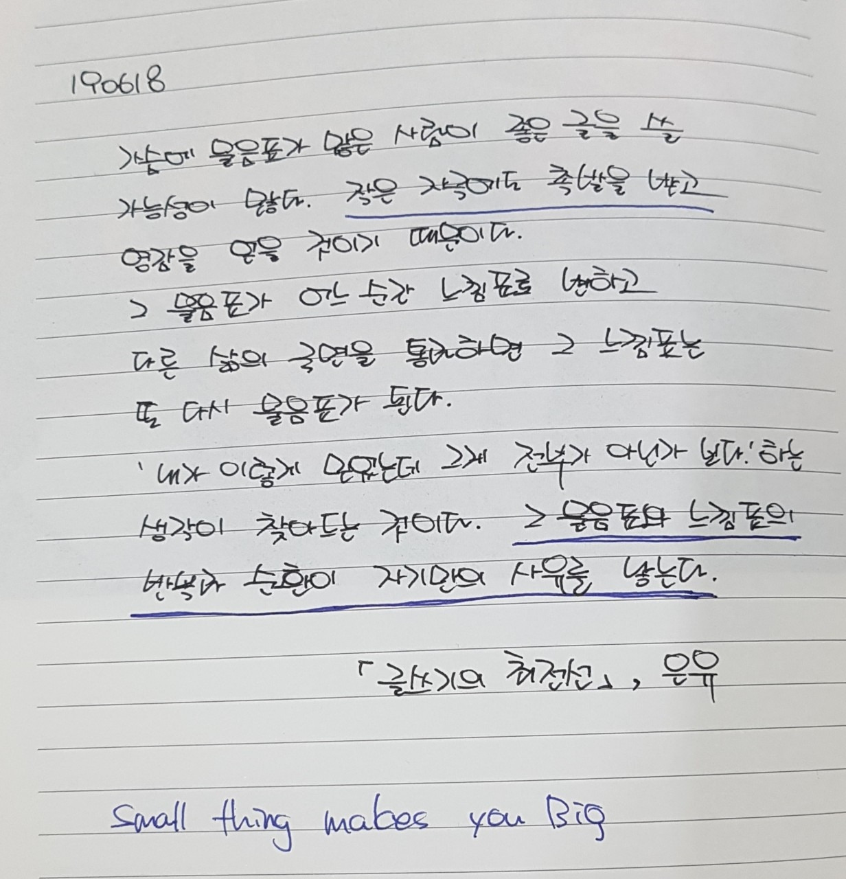 그 질문이 여러분의 삶을 통해 답을 찾아가지 않을까 생각합니다. 그 과정에서 물음표는 느낌표로 변하고 또다시 삶의 국면을 지나며 물음표가 되어 가겠죠 (^^) 문장을 그냥 읽는 것과 실제로 펜을 들고 종이에 적어보는 건 느낌이 완전 다르더라고요. 오랜만에 펜을 들어 필사 한번 해보시면 어떨까요?