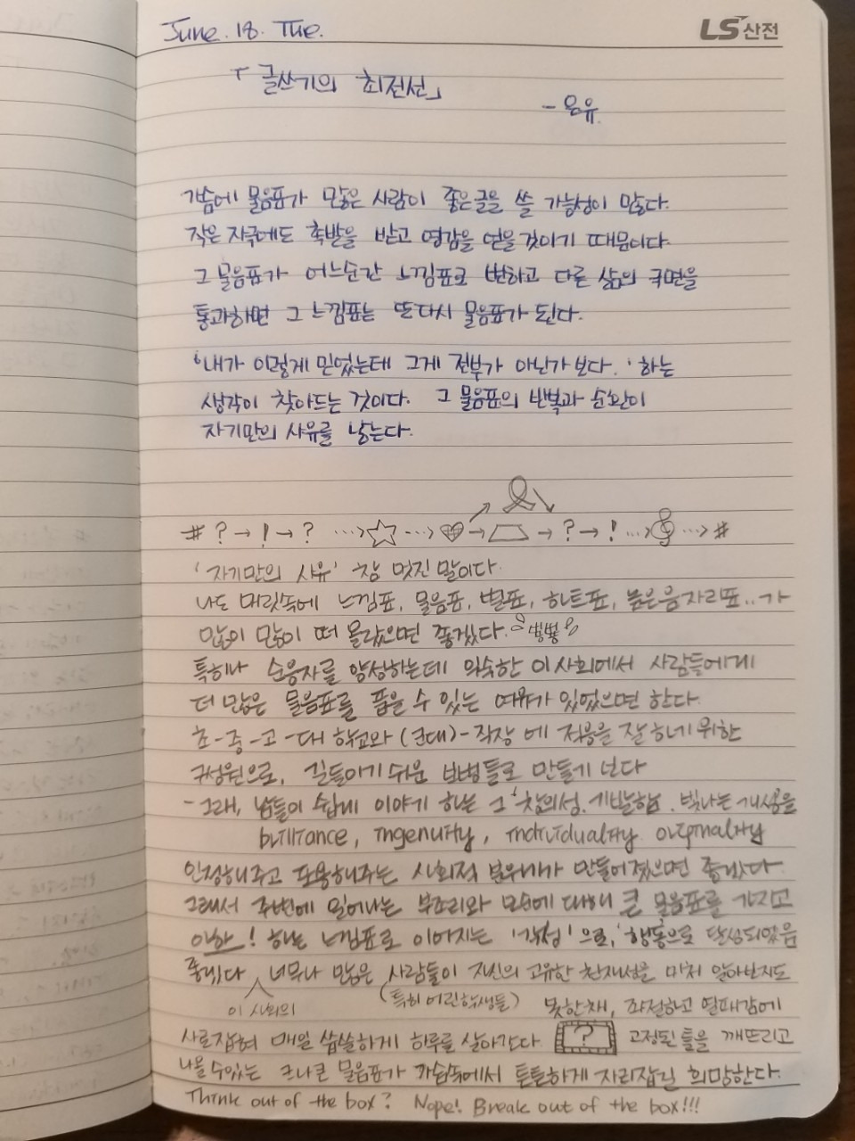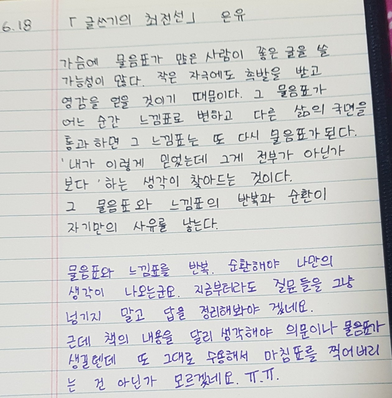 은유 작가님은 오늘 문장에서 가슴속에 물음표와 느낌표의 반복과 순환이 자기만의 사유를 낳는다고 말했습니다. 글쓰기를 잘하기 위해서는 문장을 다듬는 기술도 필요하겠지만, 자기만의 사유 또한 중요하다고 생각합니다. 여러분은 가슴에 어떤 물음표를 품고 계신가요? (어떤 질문을 갖고 살고 계신가요?)