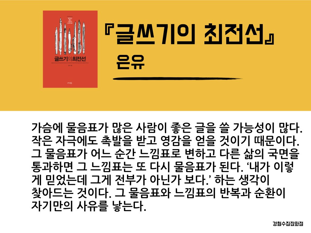 하루에 한 메시지를 전달하고 필사하며 자신의 생각을 정리해보는 필사 모임을10개월째 운영하고 있어요. 벌써 100권이 넘는 책 속에 나오는 180개의 문장(메시지)이 모였습니다. 이렇게 모인 문장 중 삶을 살아가는데 필살기가 될만한 문장을 뽑아 소개하고 있는데요, 13 번째 소개할 필살기는 은유 작가님의『글쓰기의 최전선』에서 뽑았습니다.