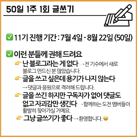 경험수집잡화점의 인기 과정 중 하나인 《50일 1주1회 글쓰기 모임》 9기가 1주일 후면 끝나네요. 즐겁게 참여해주신 33명의 9기 멤버들 덕분에 다양한 글을 읽고 공감하고 있습니다. 이어서 11기 멤버도 신청을 받습니다.