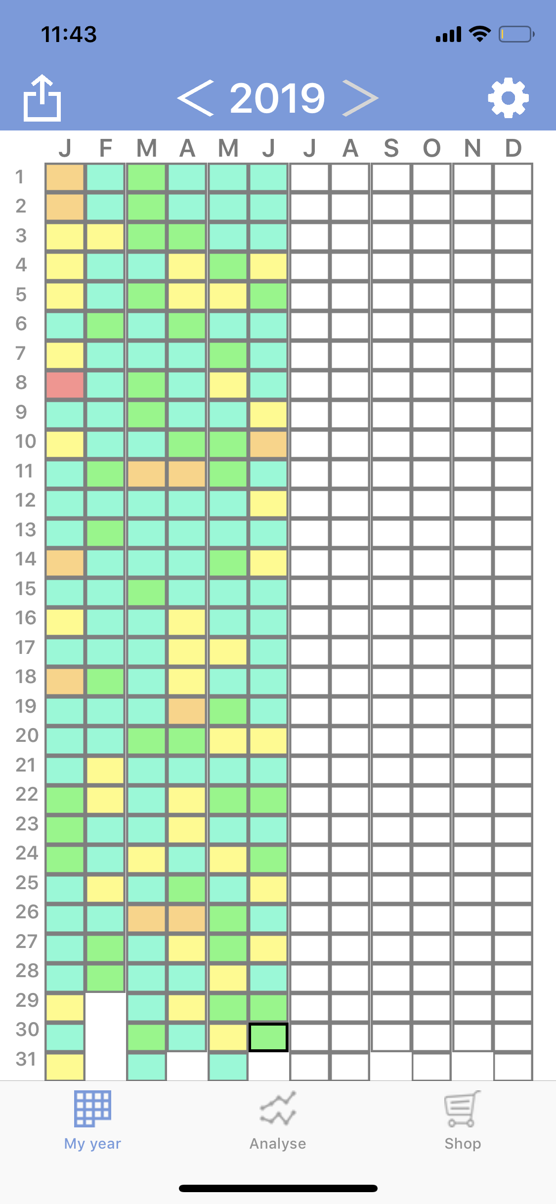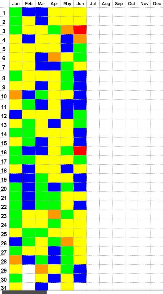 어느덧 벌써 절반이 빼곡히 컬러로 채워졌네요. 6개월을 모아 놓고 보니 전반적으로 '기분 좋은 하루'를 뜻하는 노란색이 많네요. 실제로도 기분 좋은 하루가 많았던 상반기란 생각이 듭니다. 2월 25~27일 3일 연거푸 힘들었던 하루를 보내고 3월에도 힘들었던 하루가 많았는데, 왜 그랬을까를 생각해 보니 그즈음 퇴사를 해서 정신적으로도 힘든 날들이 많았던 것 같아요. 3월에는 불안에 잠 못 이루는 날도 많았죠. 그래도 4월에 힘들었던 하루가 2일로 줄었고, 5월에는 하루, 6월에는 하루도 없을 정도로 심신이 퇴사 이후의 독립적인 삶에 적응해 가고 있는 듯합니다. (^^)