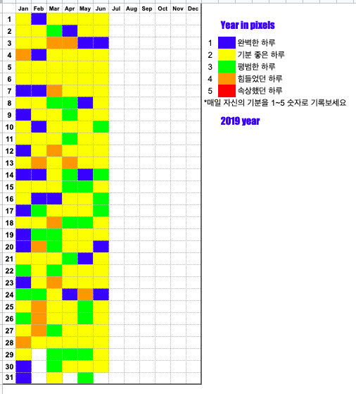 혹여나 하반기에 Year in pixels에 참여하시길 원하시거나, 구글 스프레드 시트 양식을 다운 받고 싶으신 분들은 링크를 참고해 보세요 (^^) http://bit.ly/Year_in_pixels_신청하기