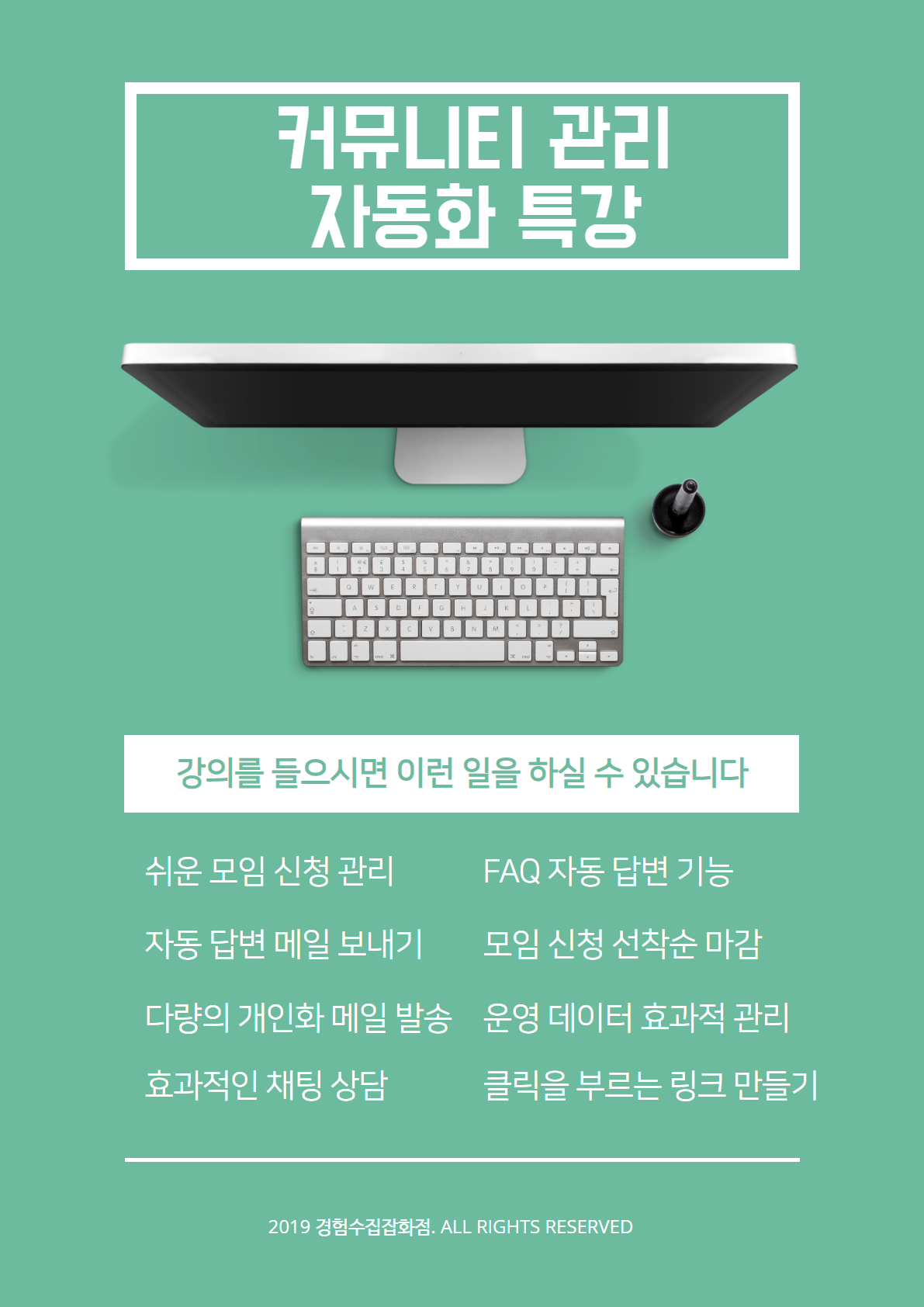 커뮤니티를 만들고 싶으신가요? 운영에 어려움이 있으신가요? 2년여간 25개가 넘는 온/오프라인 커뮤니티에서 1800여명을 만나며, 시행착오 끝에 얻은 자동화 노하우를 누구나 쉽게 배울 수 있도록 특강을 준비했습니다. 커뮤니티 운영에 관심이 있고, 운영 노하우가 궁금하시다면 한번 놀러 와 보세요. (오프라인 참석이 어려운 분들은 혼자서 보면서 쉽게 따라 할 수 있는 영상도 준비했으니 참고해주세요!)