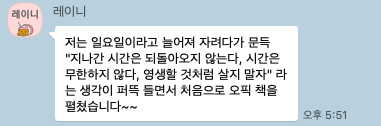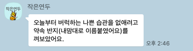 매일 아침 자기 긍정의 말을 스스로에게 해주고, 하루 중 (작은 일이라도) 새로운 시도를 해보는 「자기주도변화」모임을 진행하고 있어요. 1기 때부터 사람들의 변화가 심상치 않았는데, 2기에도 재미난 시도들과 훈훈한 경험들이 이어지고 있습니다. (^^)/