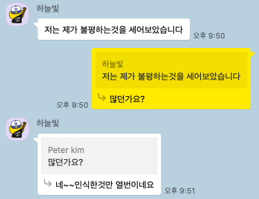 스스로 불평하는 걸 세어보신 분도 있어요. 인식한 것만 열 번이라는데, 여러분도 불평을 많이 하며 살고 있진 않나요? 이렇게 세어보는 것만으로도 불평을 많이 줄일 수 있어요.
