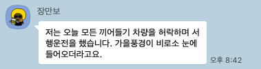 훈훈한 시도들도 이어졌어요. 운전하면 그 사람 본래의 성격이 드러난다는데, 모든 끼어들기 차량을 허락하신 혜자스러움이 놀랍습니다. 스스로를 구박하는 것을 알아차리고 이해해 주신 노력도 멋지네요.