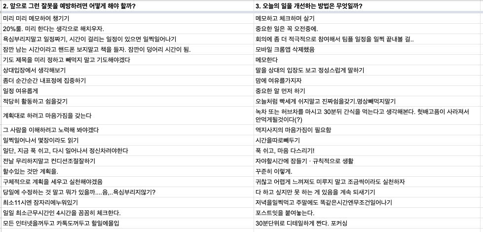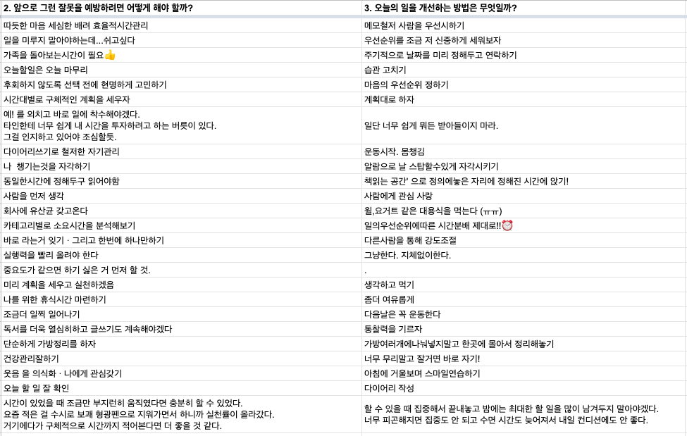 위 3가지 질문 중 2기 멤버들이 작성한 2번 3번 질문을 공유 드려요. 쭉 읽어보시는 것만으로도 계획한 일이 자꾸 밀리는 것에 대한 인사이트가 있을거라 생각해요.(이미지를 클릭하시면 좀 더 크게 보실 수 있어요)