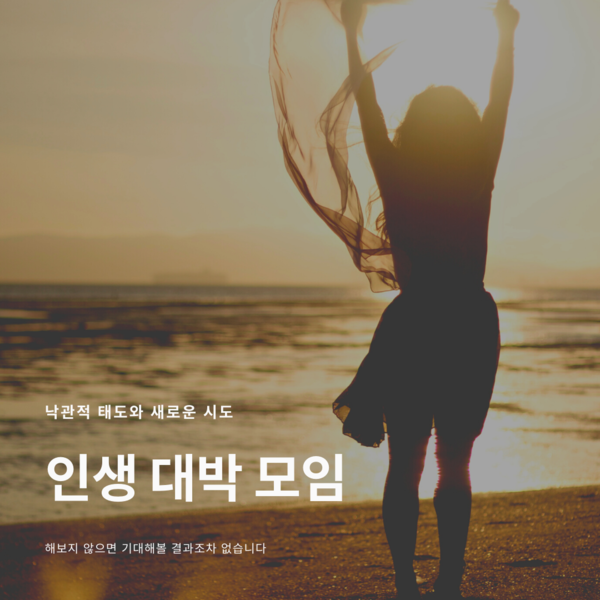 인생 대박 모임 : 낙관적 태도와 새로운 시도는 행운을 불러온다고 하더라고요. 직접 경험해보기 위해 만든 모임입니다. 아침에 일어나서 4가지 문장으로 자기 긍정을 하고 그날 하루 작지만 새로운 시도를 해보는 경험을 쌓아보세요. (링크)