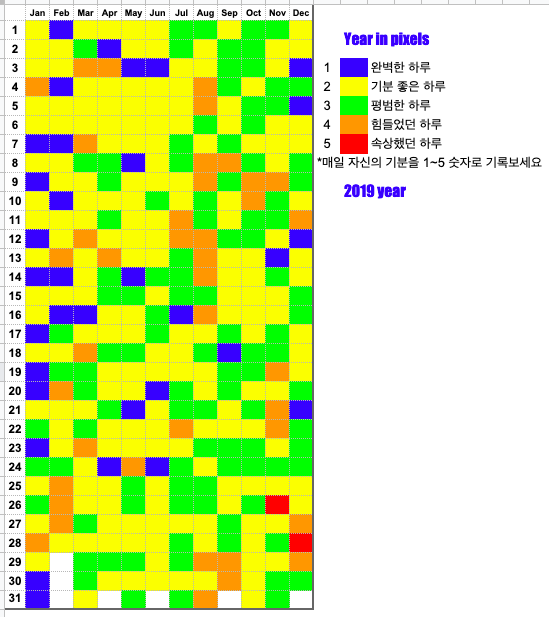 Year in pixels 모임 : 오늘 하루가 어땠는지 컬러로 채워보는 모임입니다. 하루하루가 쌓여 한 달, 1년이 되면 어떤 하루가 반복되었는지 알 수 있겠죠? 아래같은 사진을 만나게 되실거예요. 기록의 힘을 경험해보세요. (링크)