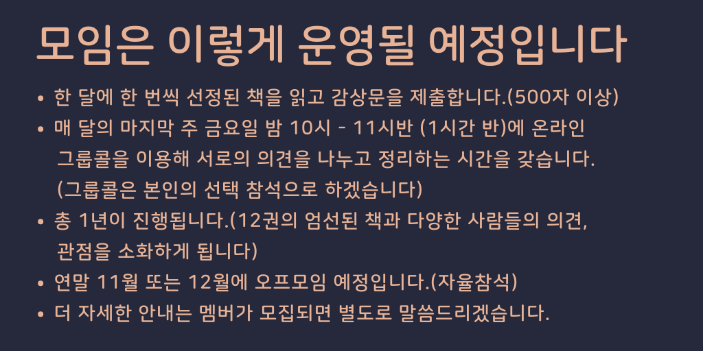 함께 성장하고, 자기만의 시선(철학)을 키워나가고 싶으신 분들의 신청을 환영합니다. 저도 2020년 여러모로 새로운 시도와 서비스를 런칭하며 바빠질 듯한데, 이 모임을 통해 저만의 철학을 키워나가고 싶은 마음에 모임을 오픈합니다. 신청을 원하시는 분은 아래 신청서를 작성 후 제출해 주세요~