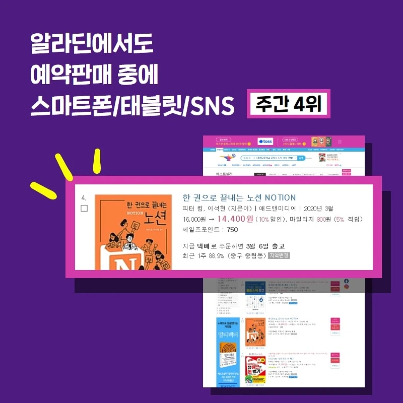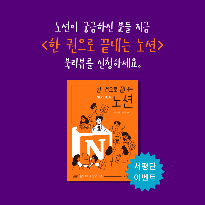 《한 권으로 끝내는 노션》서평단을 모집합니다! : 경험수집잡화점 안녕하세요 피터예요~이틀 전 말씀 드린 것처럼 두 번째 책 《한 권으로 끝내는 노션》 이 나왔습니다. 작년부터 노션이라는 생산성 서비스를 적극 활용하며 많은 강의를 하다 출간 제안을 받아서 책을 썼어요. 강의를 거듭하면서 어떻게 하면 사람들이 노션이라는 매력적인 서비스를 쉽게 배울 수 있을까를 고민했는데, 무조건 따라하기 방식으로 2시간 만에 노션을 배우시는 분들을 정말 많이 봤어요. 새로운 툴을 배우기에는 이만한 방법이 없다는 걸 깨달았죠. 그 내용들을
