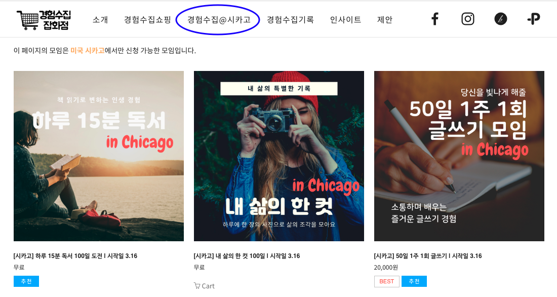 사이트에도 경험수집@시카고 라고 메뉴를 따로 만들고 그 시작으로 3개의 모임을 오픈했어요.
