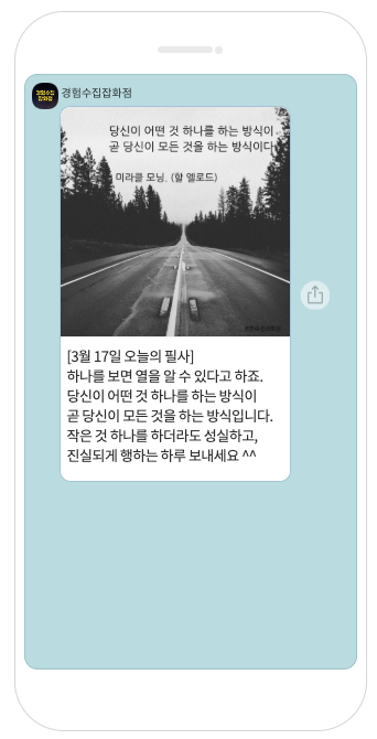 오늘은 새로 오픈한 서비스 하나를 소개드리려고요. 하루를 어떻게 시작하느냐에 따라 그날 전체가 영향을 받는다는 거 다들 아시죠? 그래서 매일 아침 9시 영감 있고, 잠시 생각해 볼 수 있는 문장을 카톡으로 배달해 드리는 서비스를 오픈했어요. 아래 사진처럼 배달이 됩니다. 문장을 직접 손으로 필사하시면서 머리와 마음에 새기시면 10배는 더 좋습니다. 채팅창 통해서 그 문장 관련 이야기를 나눌 수도 있고요~