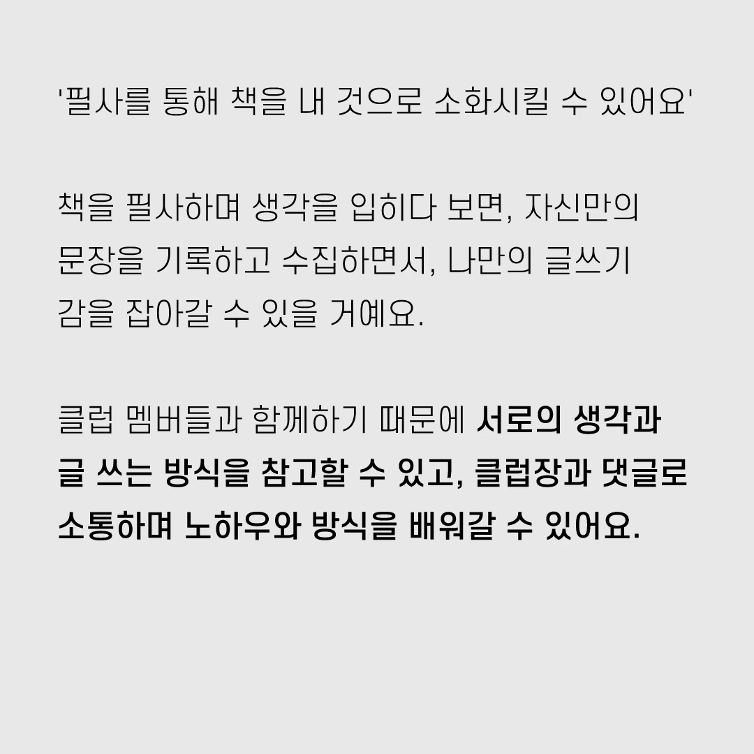 책을 필사하며 생각을 입히다 보면, 자신만의 문장을 수집하면서, 나만의 글쓰기 감을 잡아갈 수 있을 거예요.
