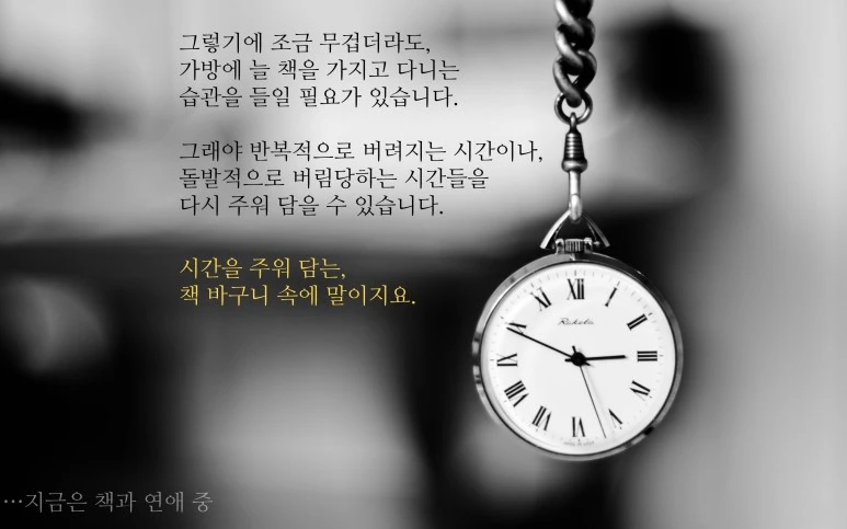 조금 무겁더라도, 가방에 늘 책을 가지고 다니는 습관을 들일 필요가 있습니다. 그래야 반복적으로 버려지는 시간이나 돌발적으로 버림당하는 시간들을 다시 주워 담을 수 있습니다. 시간을 주워담는, 책 바구니 속에 말이지요.