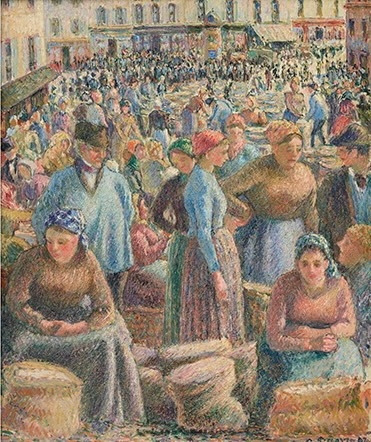 피사로에게 시장은 상품을 매매하는 매장을 넘어서 사람들이 어울려 사는 삶의 공간이었다. 사람들은 생계를 위해 상품을 사고파는 활동을 했지만, 화가의 눈에는 그 활동마저 만남과 대화가 오고 가는 의식이자 작은 축제였다. 상인들 뒤편 광장에는 사람들이 둥그렇게 모여 선 채 만남을 즐기고 있었다.