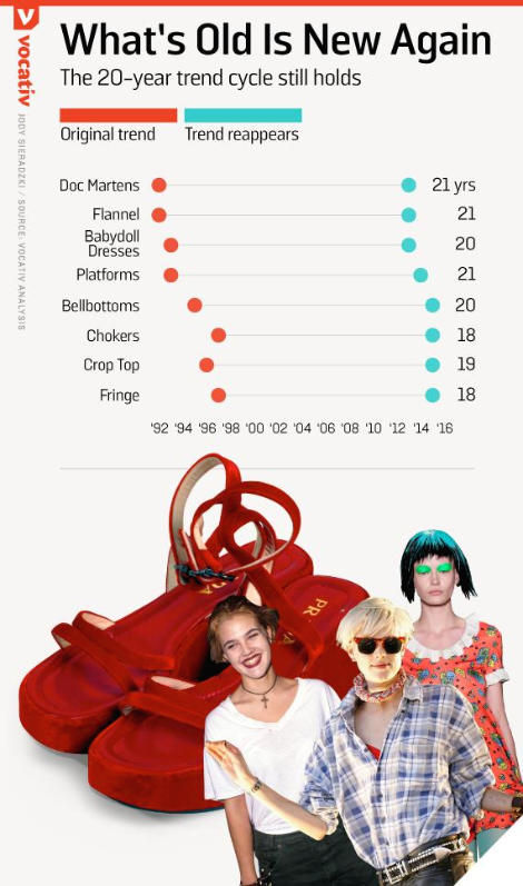 어떤 학자는 20세기 유행은 10년을 주기로 반복되어 나타나는 20년 주기 이론을 제시했었습니다. 젊은 사람들은 자라면서 본 스타일에는 덜 새롭게 보고, 이것을 새롭게 보기 위해서는 최소 20년이 필요하다고 했죠. 'VOCATIV ANALYSIS' 자료에 의하면 닥터 마틴 슈즈와 플란넬 셔츠는 92년도에 등장해 21년 뒤에 다시 등장했고, 초커는 97년도에 등장해 2015년인 19년 뒤에 다시 나타났습니다. 그 외에 벨보텀 팬츠, 크롭탑 등 다른 아이템들도 20년 내외로 다시 유행했습니다. 패션 저널 FIB(Fashion Industry Broadcast)에서 'The 20 year Trend Cycle : What is Next?'라는 기사에서는 '20년 규칙'을 언급합니다. 20년 규칙은 패션업계에서 가장 주기적인 움직임이고 현재 인기를 누리는 상품이 20년 후에 다시 유행한다는 개념입니다.