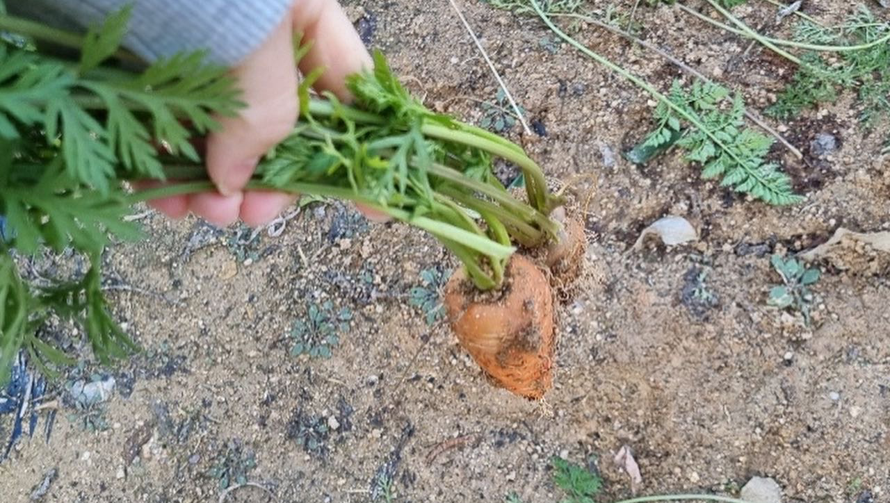 텃밭에서 뽑은 당근을 씻어 우적우적 씹어먹기도 하고