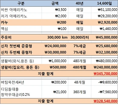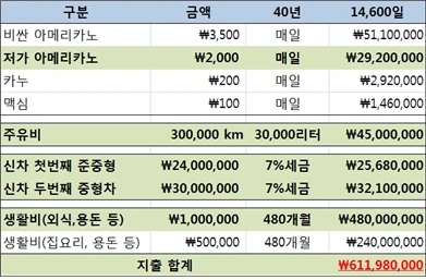 고작 커피값+주유비+새차2대뽑고+한달생활비100만원 계산해서 40년 돌렸더니 지출금액이 6억이 넘는다? 이거 뭐가 계산이 잘못된거 아닌가 제가 생각을 해보고 있습니다.
