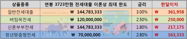 => 연봉 3700만원 이상이면 전세대출 이론상 한도는 1.44억이 나옵니다.