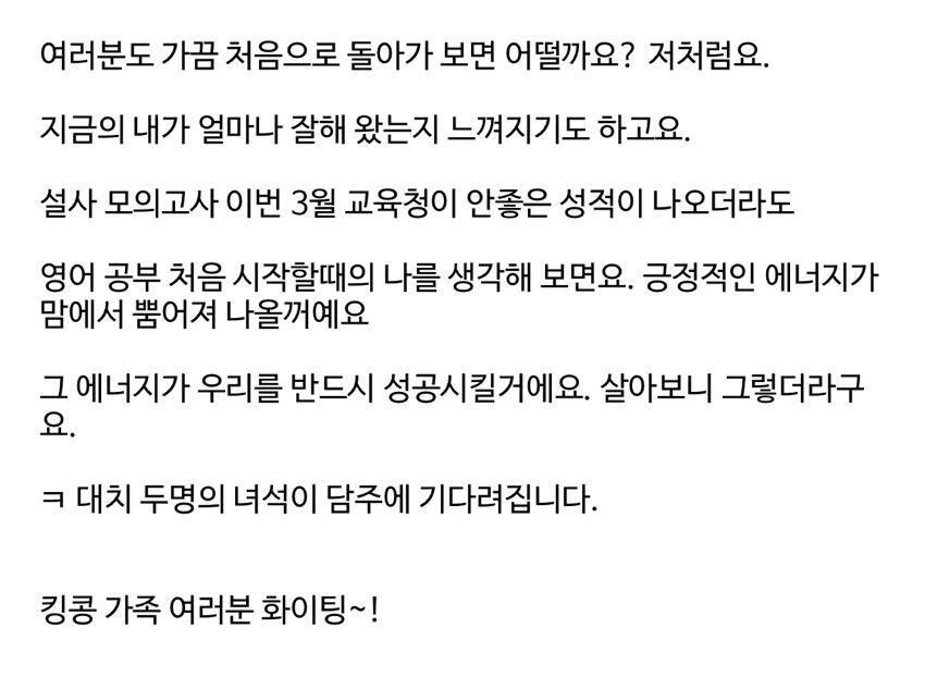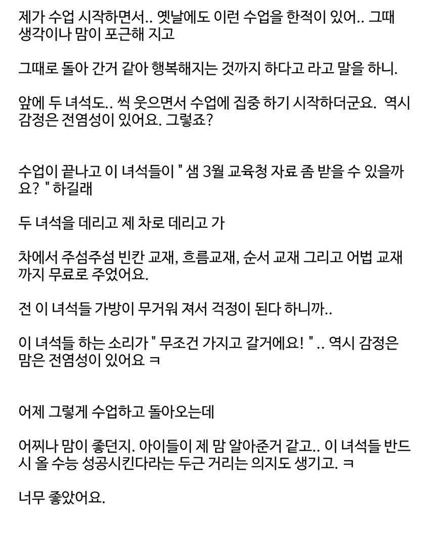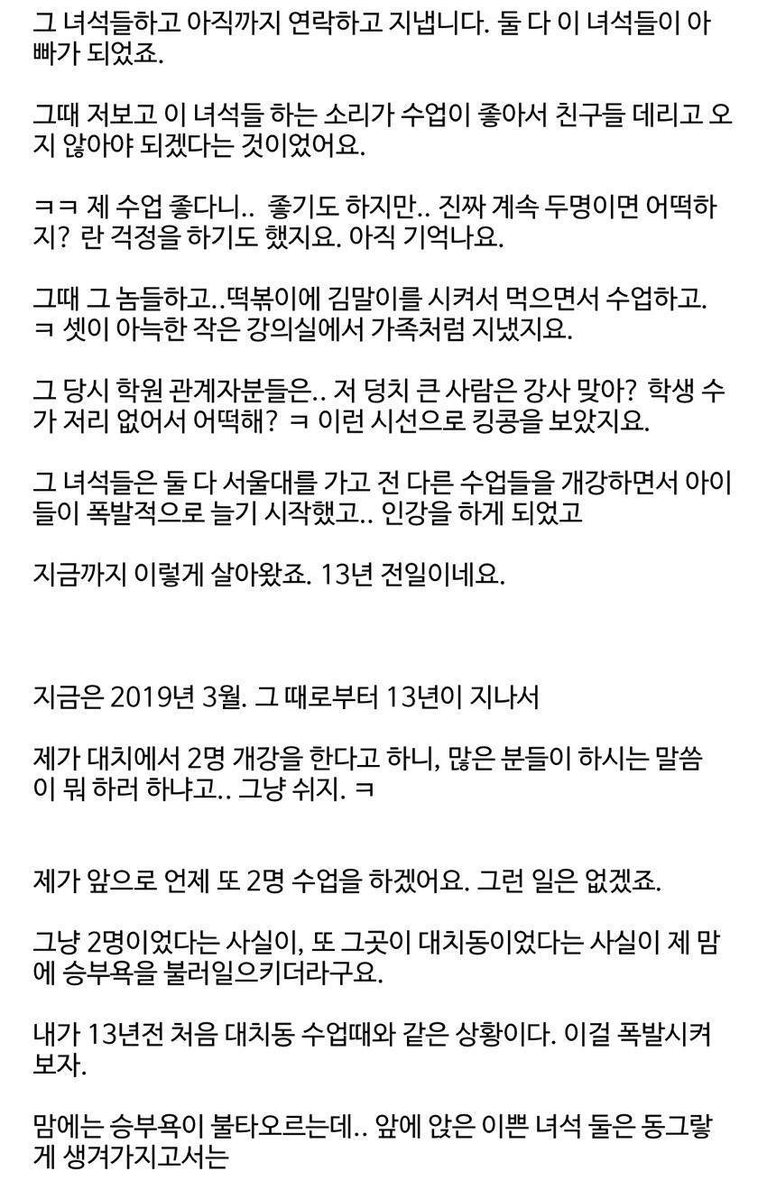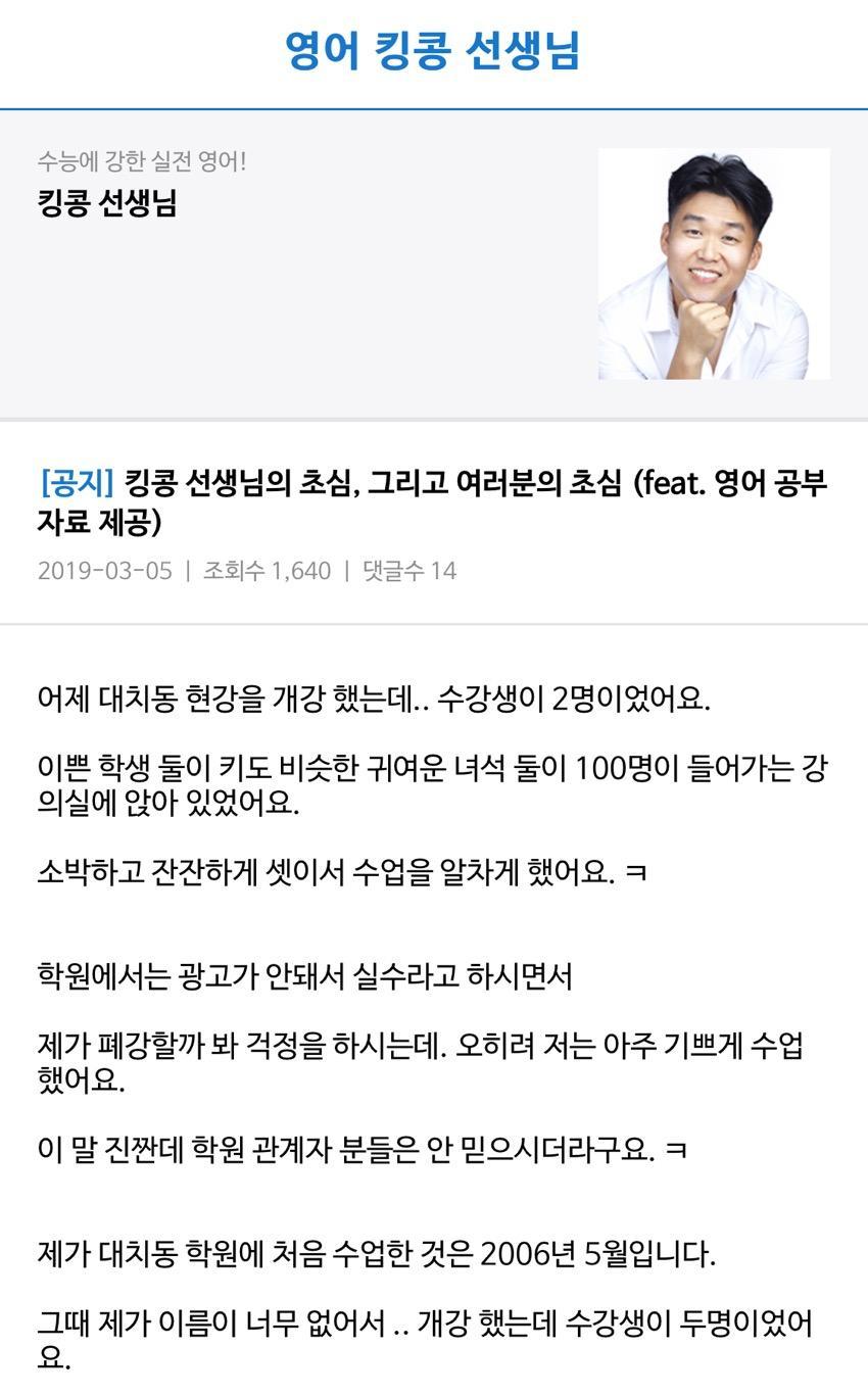 신인강사시절 수강생이 너무 없어 곤란했던 썰들은 꽤 많다. 그런데 내가 이 글에서 유독 진한 감동을 느낀 이유는 그로부터 13년이 지난 후에도 같은 일이 벌어졌는데 같은 마음가짐으로 강의에 임했다는 것이다.( 그 와중에 수험생들을 정말 예뻐하는 게 느껴진다. 나도 아이들을 무척 좋아하는데 얼마나 예쁜지 표현을 할 때마다 저 '동그래서 예쁘다.'라는 말을 자주 쓴다.)
